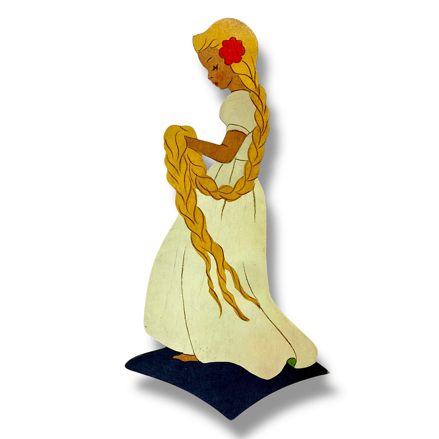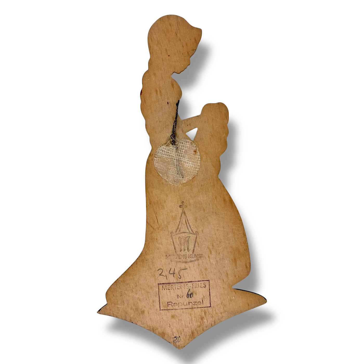 l1940er Mertens-Kunst: Kleines Rapunzel mit dickem Zopf in Hellblau, Handbemalt, 20 cm, Märchen-Holzbild 🇬🇧 1940s Alfred Mertens: Small Rapunzel with Thick Braid in Light Blue, Hand-painted, 20 cm, German Wall Figure