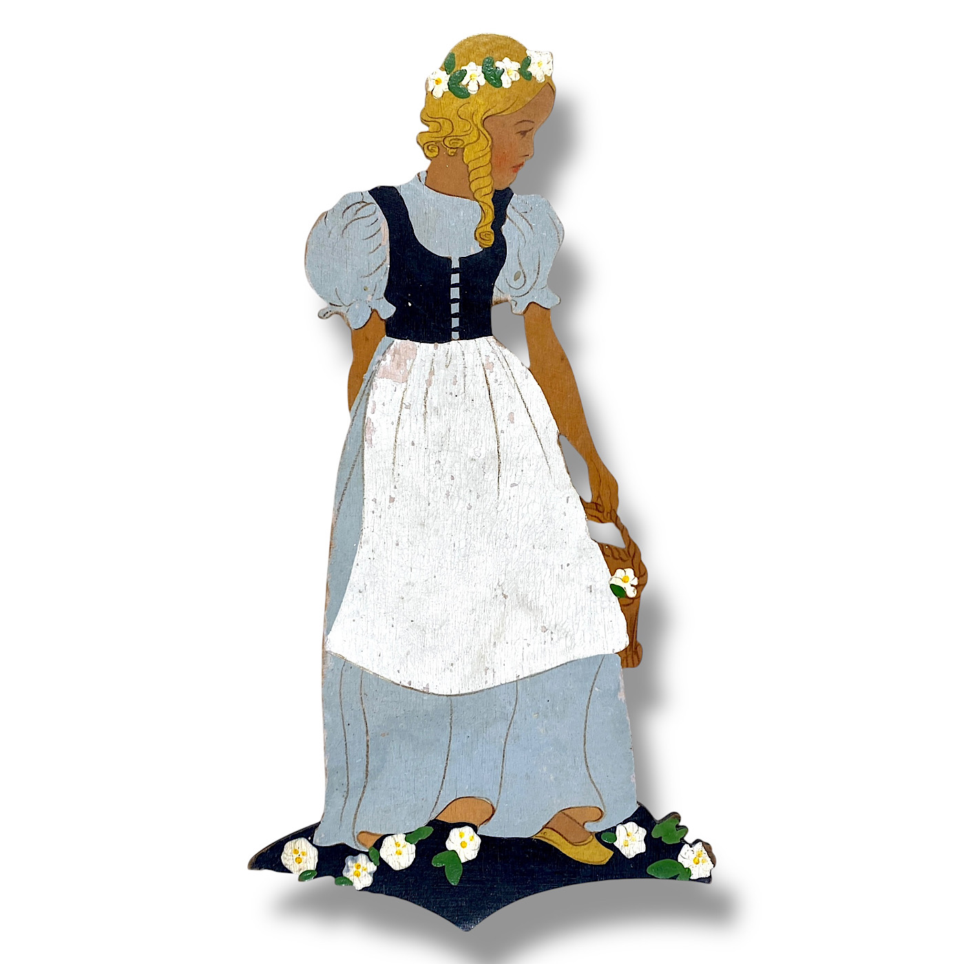 🇬🇧 MERTENS, ERAS: You can divide the German Wall Figures by Alfred Mertens into antique, mid-century, and vintage. The antique wood plaques are from the 1930s and completely hand-painted. Some of them also include elements of Art Nouveau and Art Deco style—for example, the early Seven Ravens sister with the hairband. Around the middle of the last century, the figures became smaller due to the material shortages during the Second World War. Most of the 1940s wood plaques were still entirely hand-painted. By the 1950s, however, Mertens-Kunst began printing the slim base shapes—faces, hands, and outlines—while the rest of the figure was still painted by hand, including the edges. The vintage wall figures were fully screen-printed, roughly from the 1960s to the 1980s, when the very last fairy tale motifs were designed by Mertens-Kunst. (Buch/25)