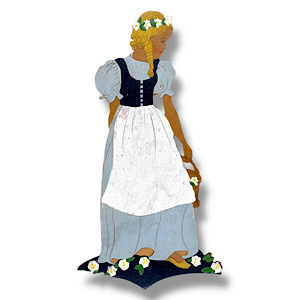 HOLLAND, HANDARBEID/HANDBEMAHLT: Es gibt schöne, sich sehr ähnelnde Wandfiguren aus den Niederlanden, vermutlich aus den 1930er und 1940er Jahren. Manchmal steht „Handarbeid Holland“ (häufig in rot) oder „Handbemahlt“ auf der Rückseite. „Handarbeid“-Beispiele: Pelikan-Reiter, Zaun-Kinder, Waschzuber-Mädchen und ein Angler-Zwerg, an dem man die Technik der Motivaufbringung erkennt, denn auf der Rückseite ist das gleiche Motiv aufgedruckt, nur unbemalt. „Handbemahlt“-Beispiele: ein Junge mit einem Fußball, ein Junge mit einer Kerze und ein Mädchen mit einer riesigen Tasche. Manchmal findet man nur (oder zusätzlich) die Zahl 1, 2, 3 oder 4 und teilweise einen dreieckigen Papieraufhänger. Es könnte sein, dass es sich immer um den gleichen Hersteller handelt. Vermutlich von einem anderen Produzenten stammen die Niederlande-Figuren mit den dicken braunen gedruckten Umrissen, zum Beispiel ein erschöpfter Fliegenpilz-Zwerg. Weiß jemand mehr darüber? Bitte schreiben Sie mir!