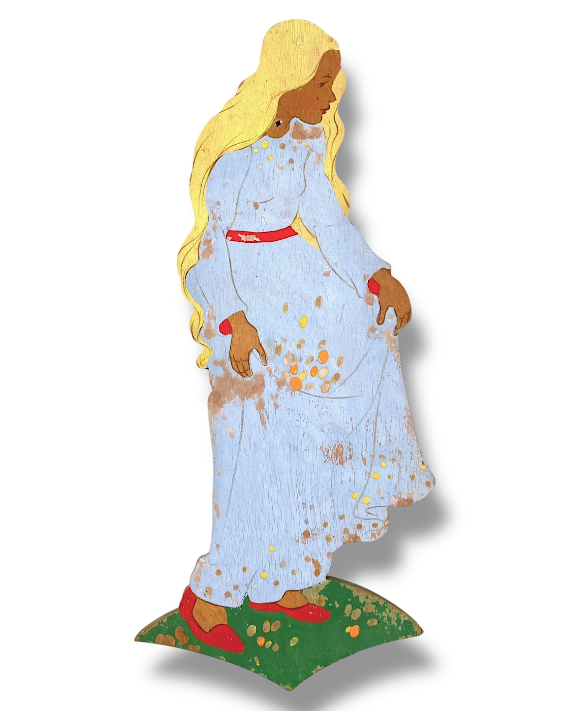 1930er Mertens-Kunst: Frühe Goldmarie mit Wasserfallhaaren (Frau Holle), Sperrholz, Handbemalt 23 cm [EN] Antique Alfred Mertens: Early Golden Mary with Red Belt (Mother Holle/Hulda), German Wall Figure
