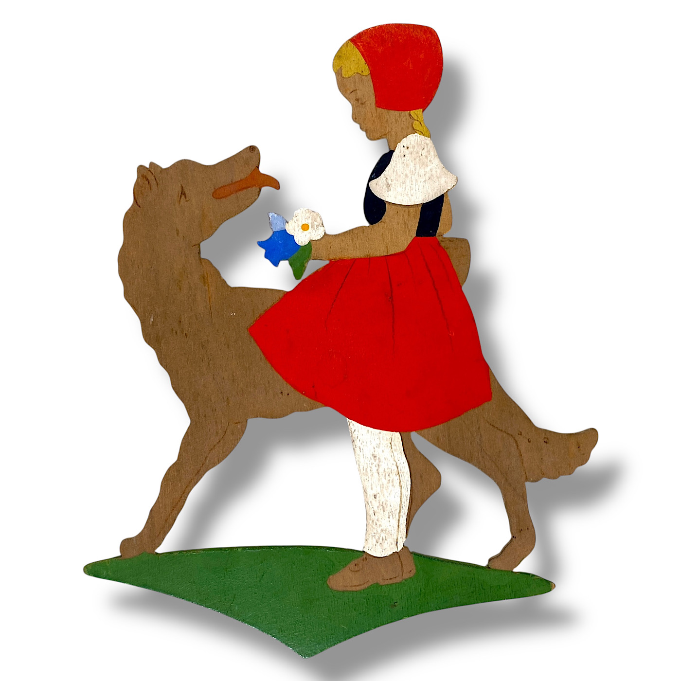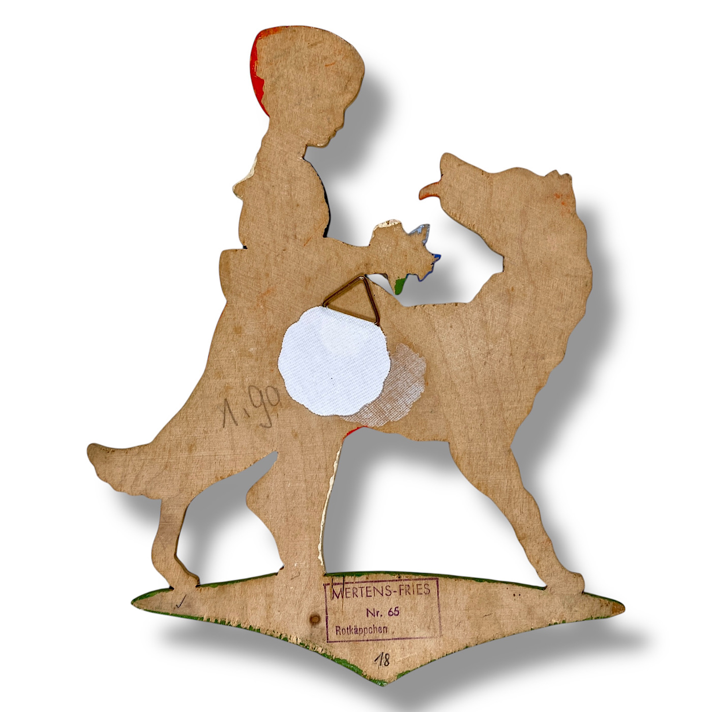 1940er Mertens-Kunst: Rotkäppchen mit Wolf, Kriegsware, Handbemalt, 18 cm, Märchen-Holzbild 🇬🇧 1940s Alfred Mertens: Little Red Riding Hood with Wolf, Wartime Production, Hand-painted, 18 cm, German Wall Figure