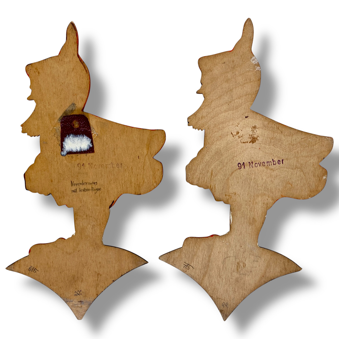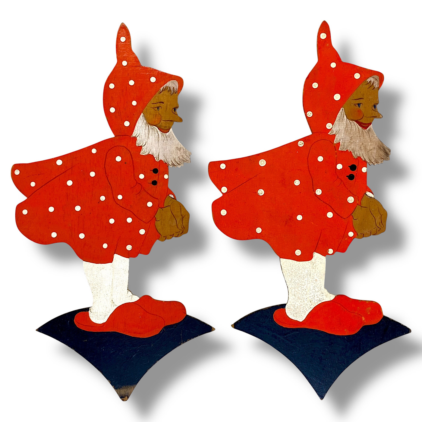1930er Märchen-Holzbilder von Mertens-Kunst: Zwei Versionen vom November-Zwerg mit kalten Händen im roten Punkte-Hoodie, Handbemalt, 22 cm 🇬🇧 1930s German Wall Figures by Alfred Mertens: Two Versions of the November Dwarf with Cold Hands in Red Polka Dot Hoodie, Hand-painted, 22 cm