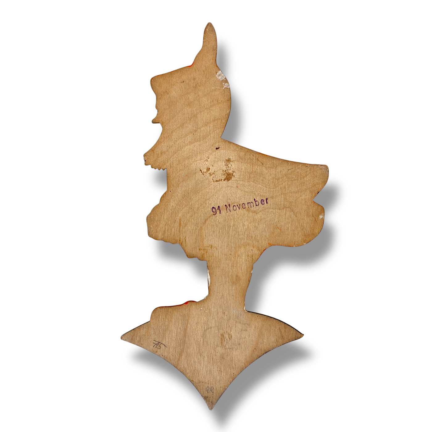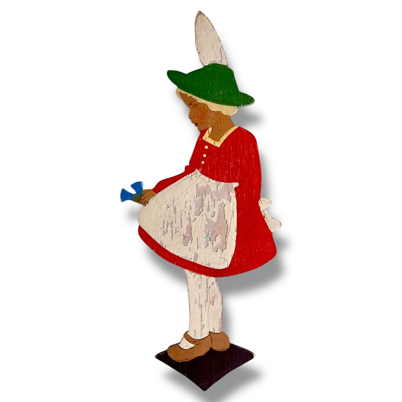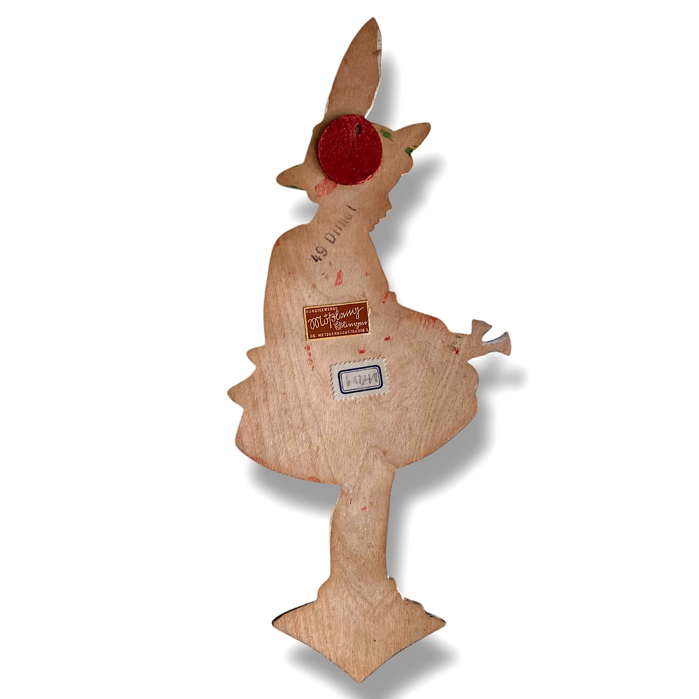 1930er Holz-Wandfigur/Kind von Mertens-Kunst: Rotes Dirndlmädchen mit großer weißer Feder, Handbemalt 🇬🇧 1930s Wooden Wall Figure/Child by Mertens-Kunst: Red Dirndl Girl by Mertens-Kunst, Hand-painted