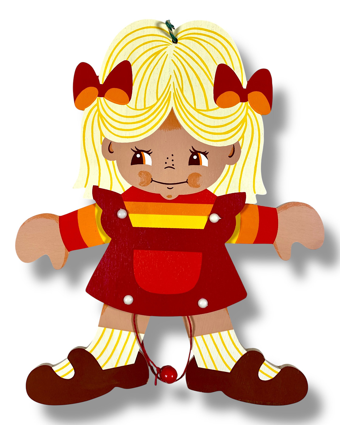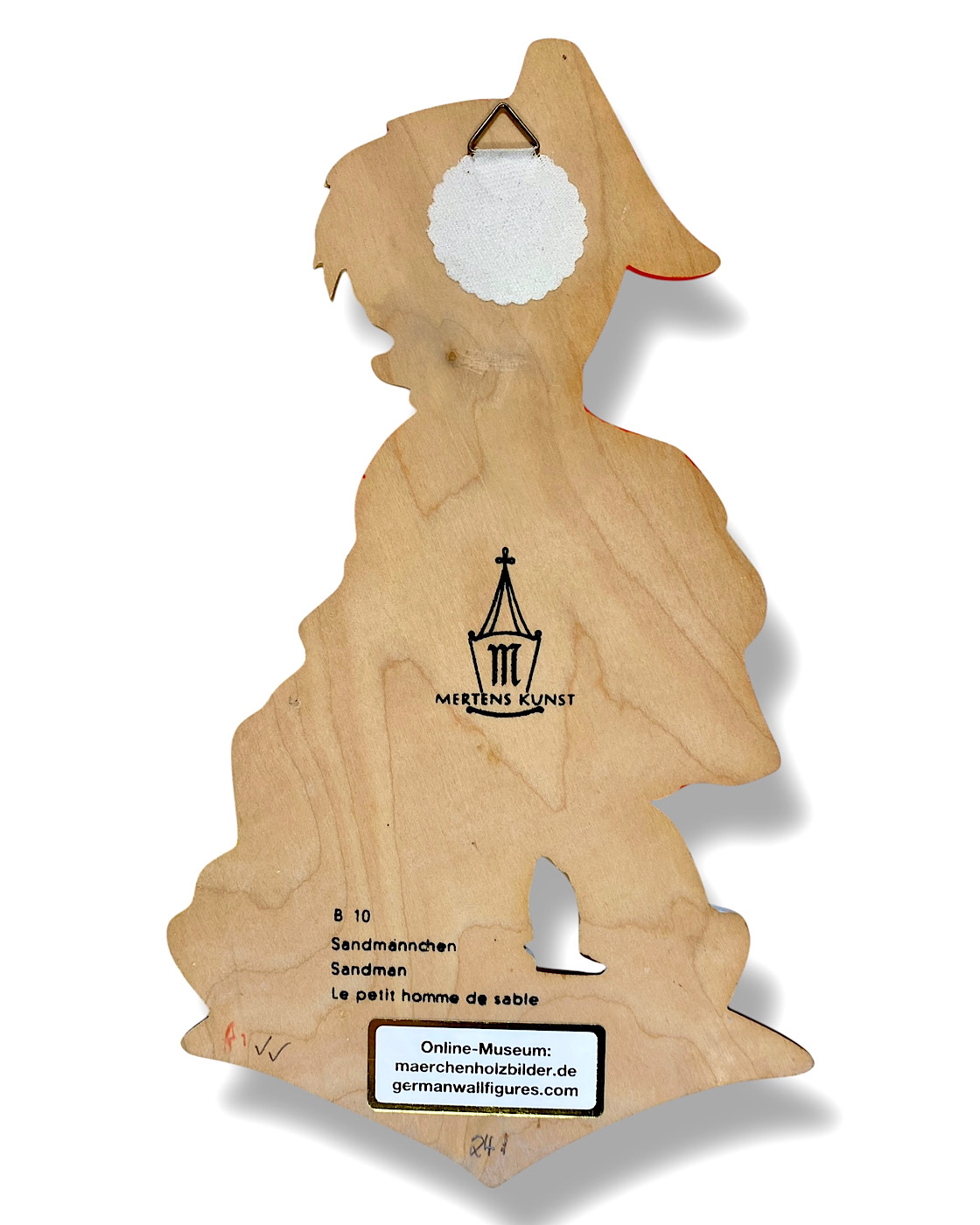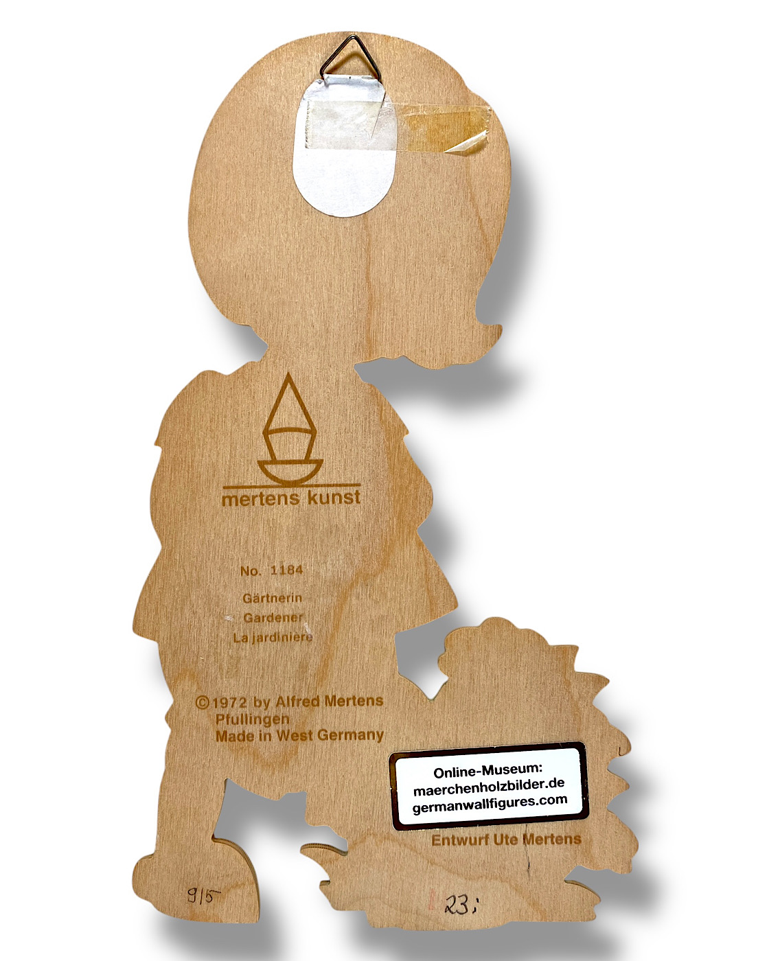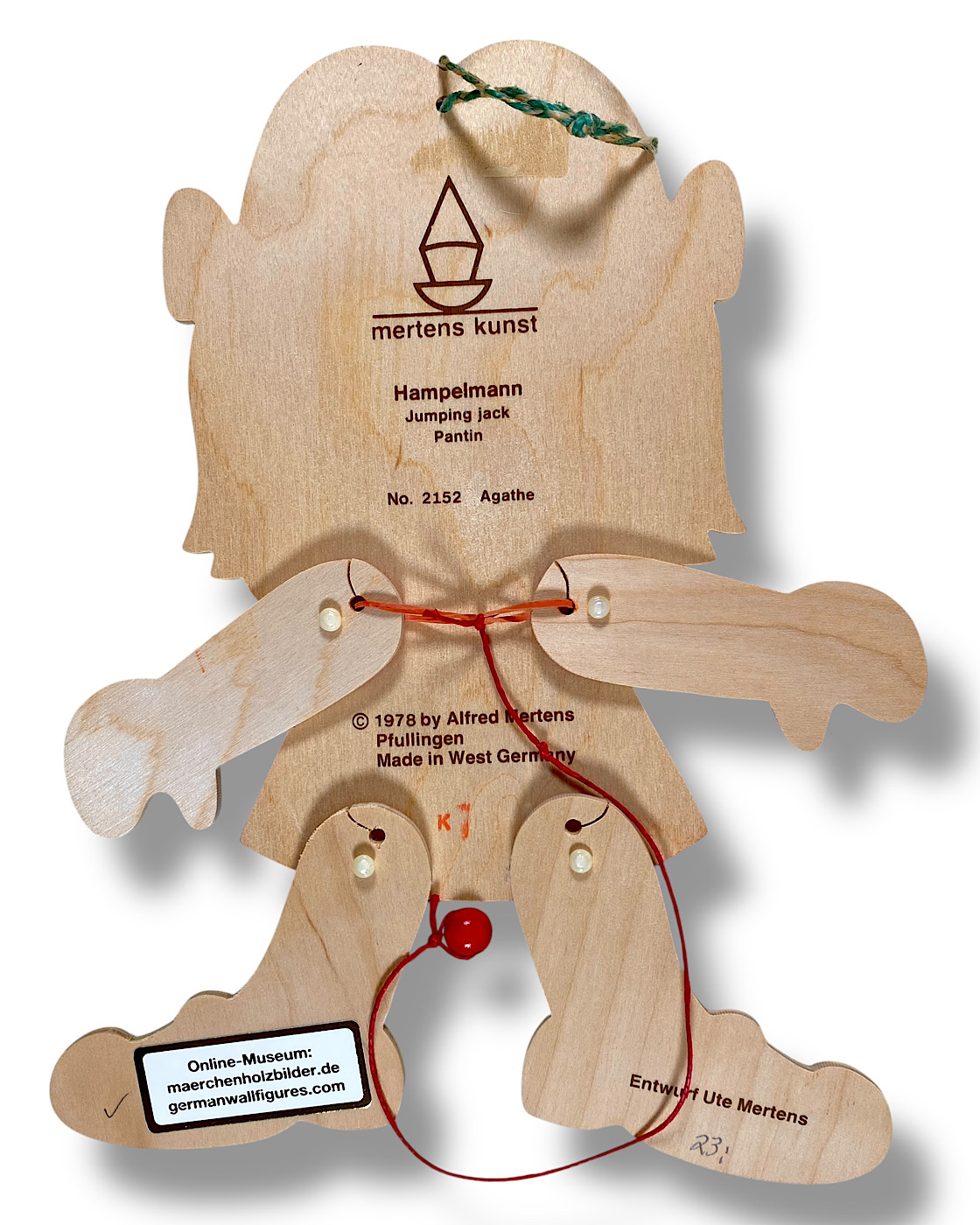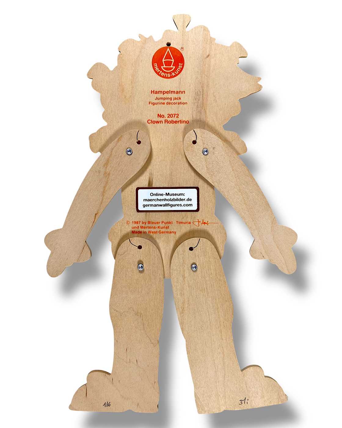 MERTENS, HAMPELMÄNNER: Der große Hersteller von Märchen-Holzbildern, Alfred Mertens, hat im letzten Jahrhundert auch mehrere Hundert verschiedene Hampelmänner produziert, mit teilweise sehr hohen Auflagen, wie zum Beispiel die berühmten Enten „Quack“ und „Quacksi“ aus den 1960er-Jahren. Auch bekannte Künstler entwarfen Hampelmänner für Mertens-Kunst; Ostheimer designte beispielsweise die „Michel“-Figur. Die allermeisten Hampelmann-Figuren wurden jedoch von Ute Mertens entworfen, der Tochter von Alfred Mertens. Manchmal steht der ganze Name, manchmal nur die gedruckte Signatur „Ute“ auf diesen Figuren, oft unten seitlich auf einem Fuß. (Aus dem Buch: Die Ära der Märchen-Holzbilder, Vintage German Wall Figures, 2025, Christiane Dietz)