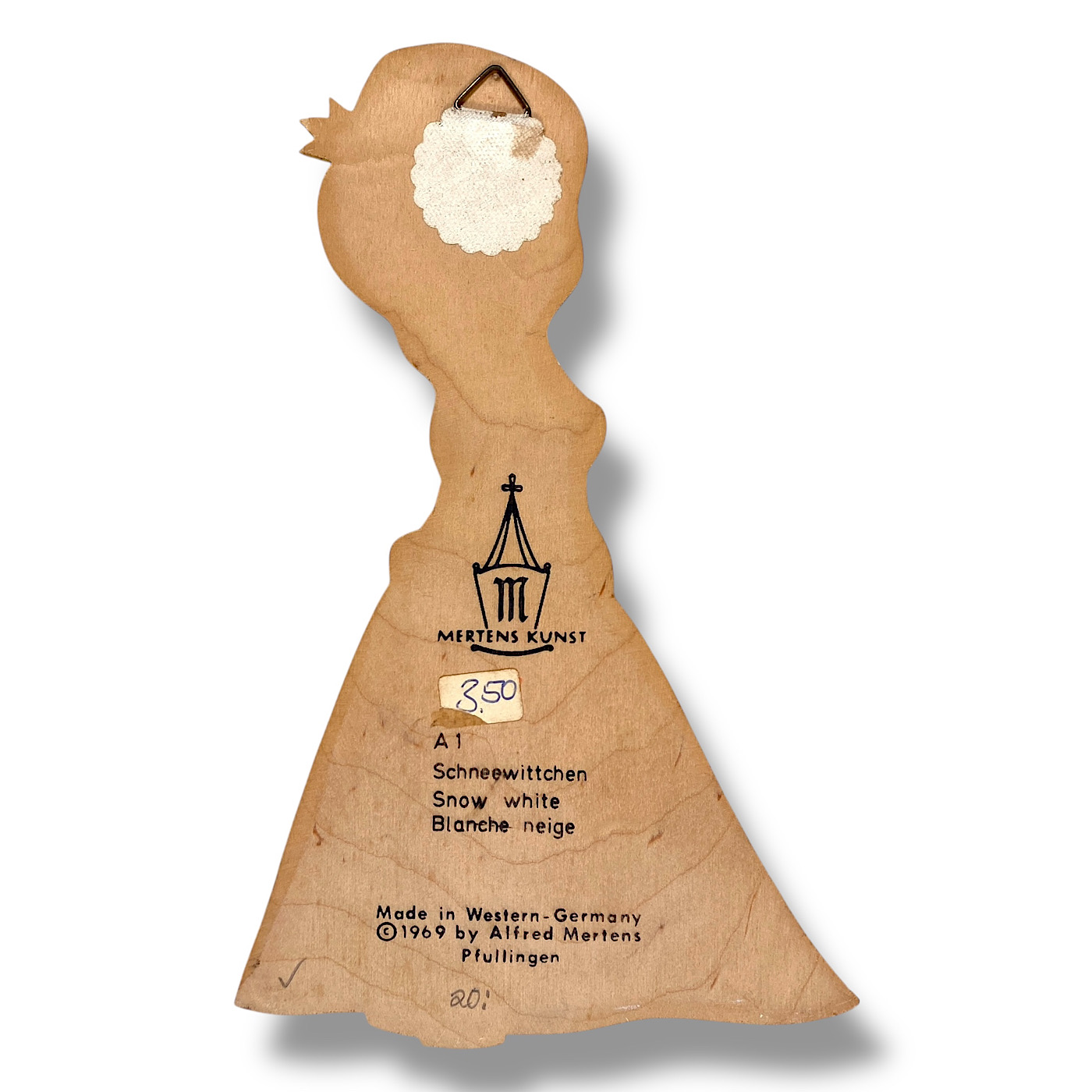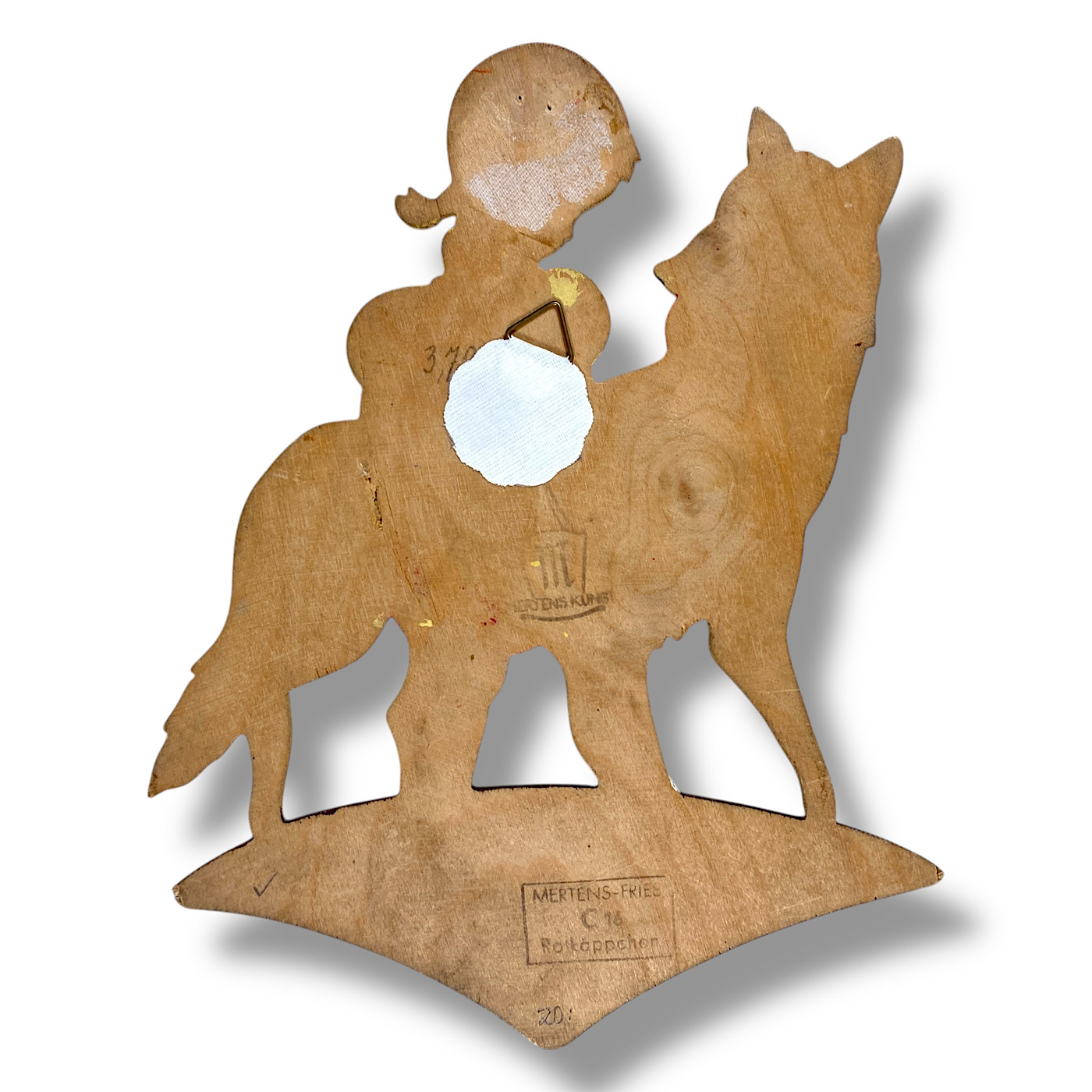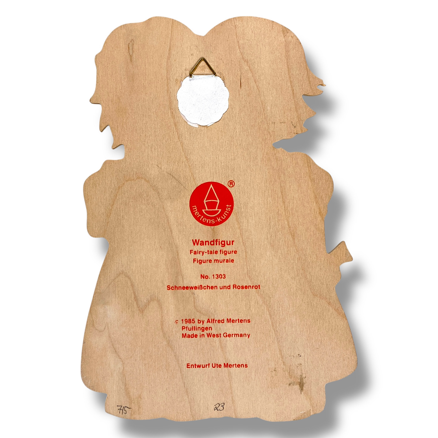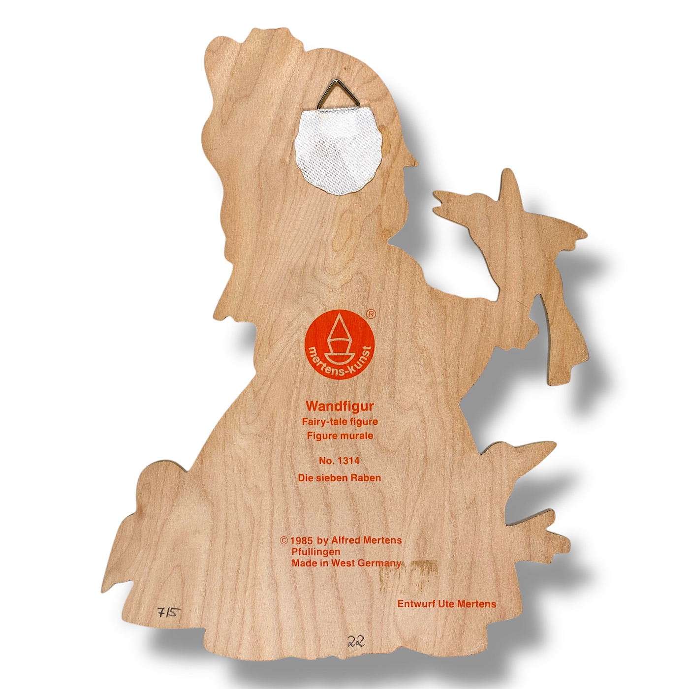 🇬🇧 MERTENS, ERAS: You can divide the German Wall Figures by Alfred Mertens into antique, mid-century, and vintage. The antique wood plaques are from the 1930s and completely hand-painted. Some of them also include elements of Art Nouveau and Art Deco style—for example, the early Seven Ravens sister with the hairband. Around the middle of the last century, the figures became smaller due to the material shortages during the Second World War. Most of the 1940s wood plaques were still entirely hand-painted. By the 1950s, however, Mertens-Kunst began printing the slim base shapes—faces, hands, and outlines—while the rest of the figure was still painted by hand, including the edges. The vintage wall figures were fully screen-printed, roughly from the 1960s to the 1980s, when the very last fairy tale motifs were designed by Mertens-Kunst. (Buch/25)
