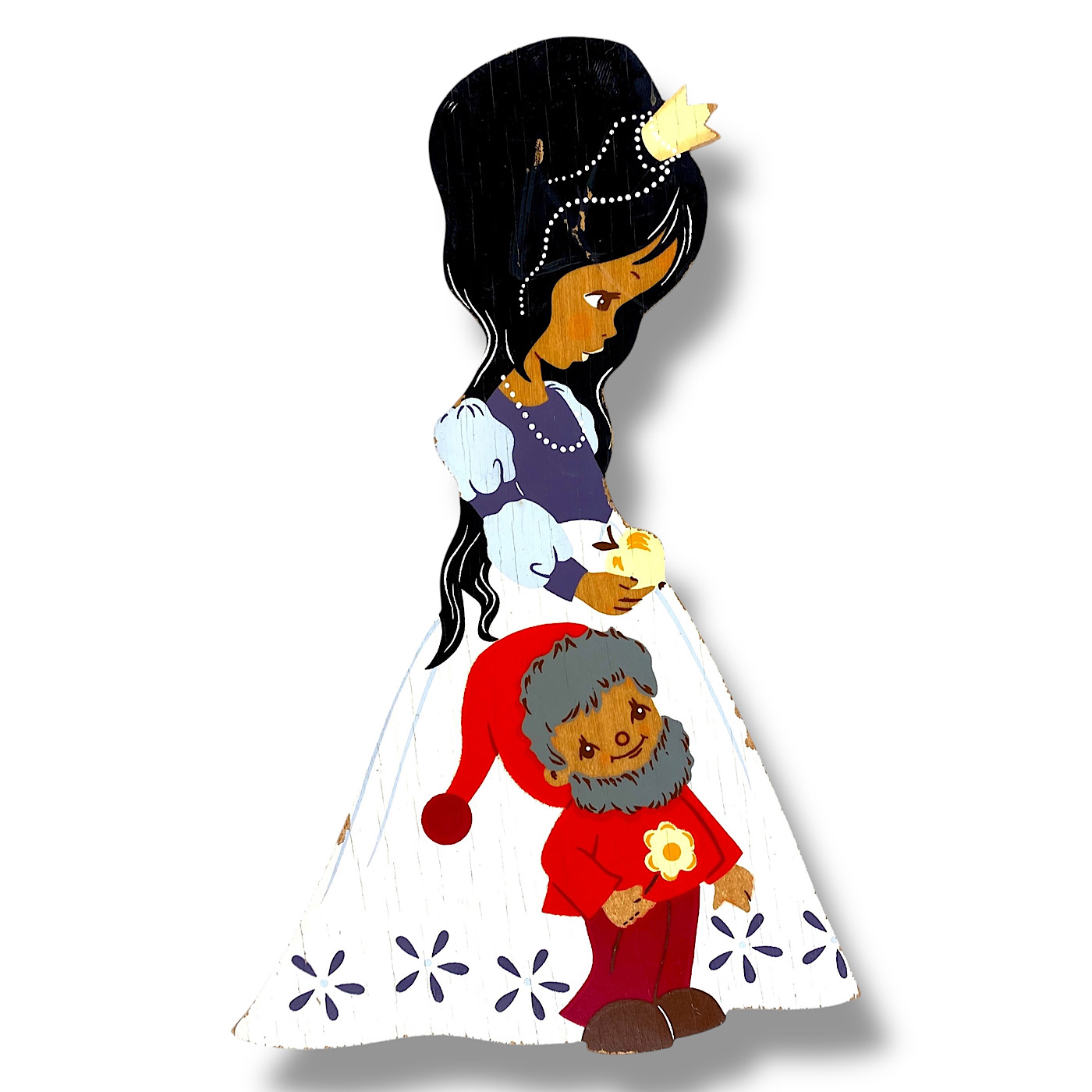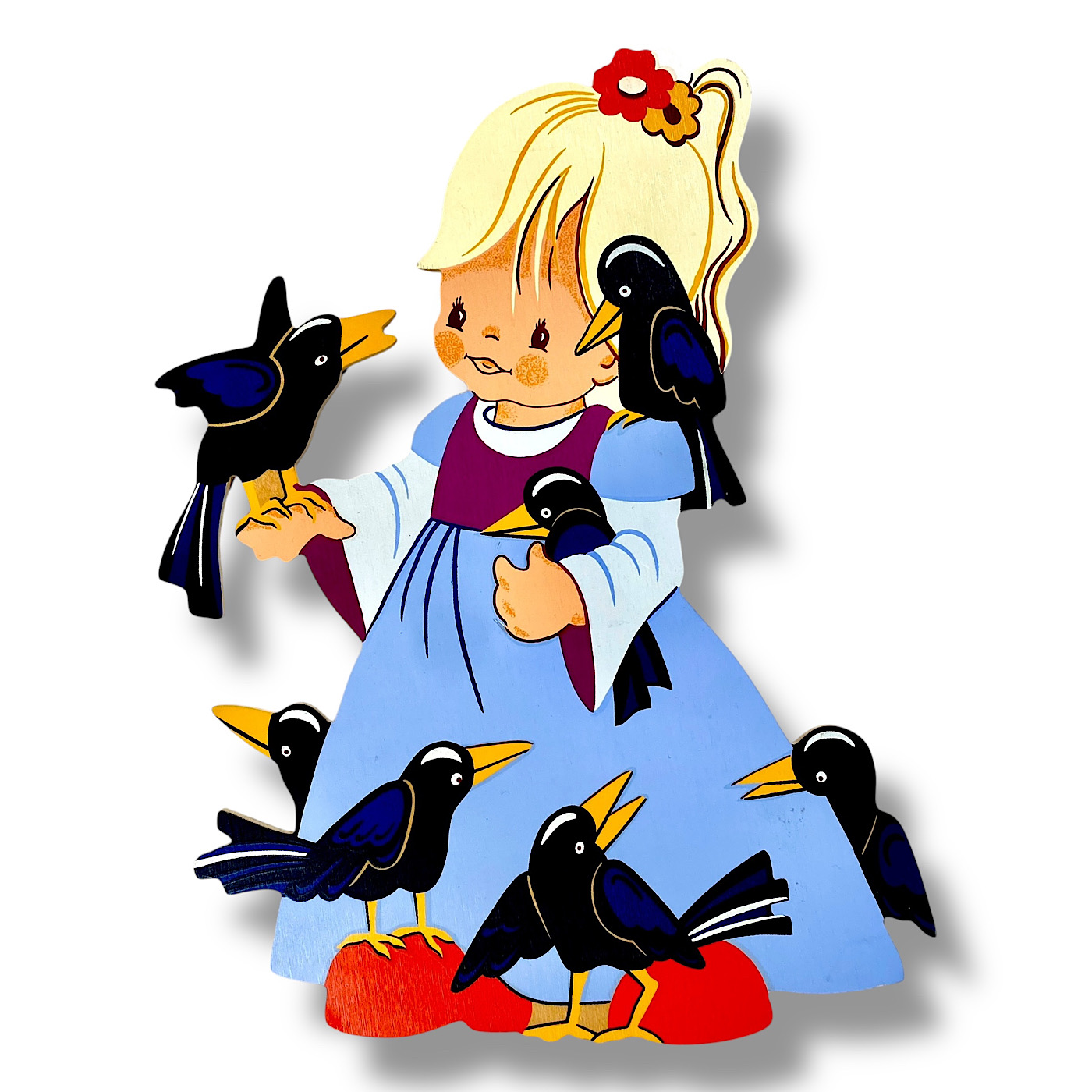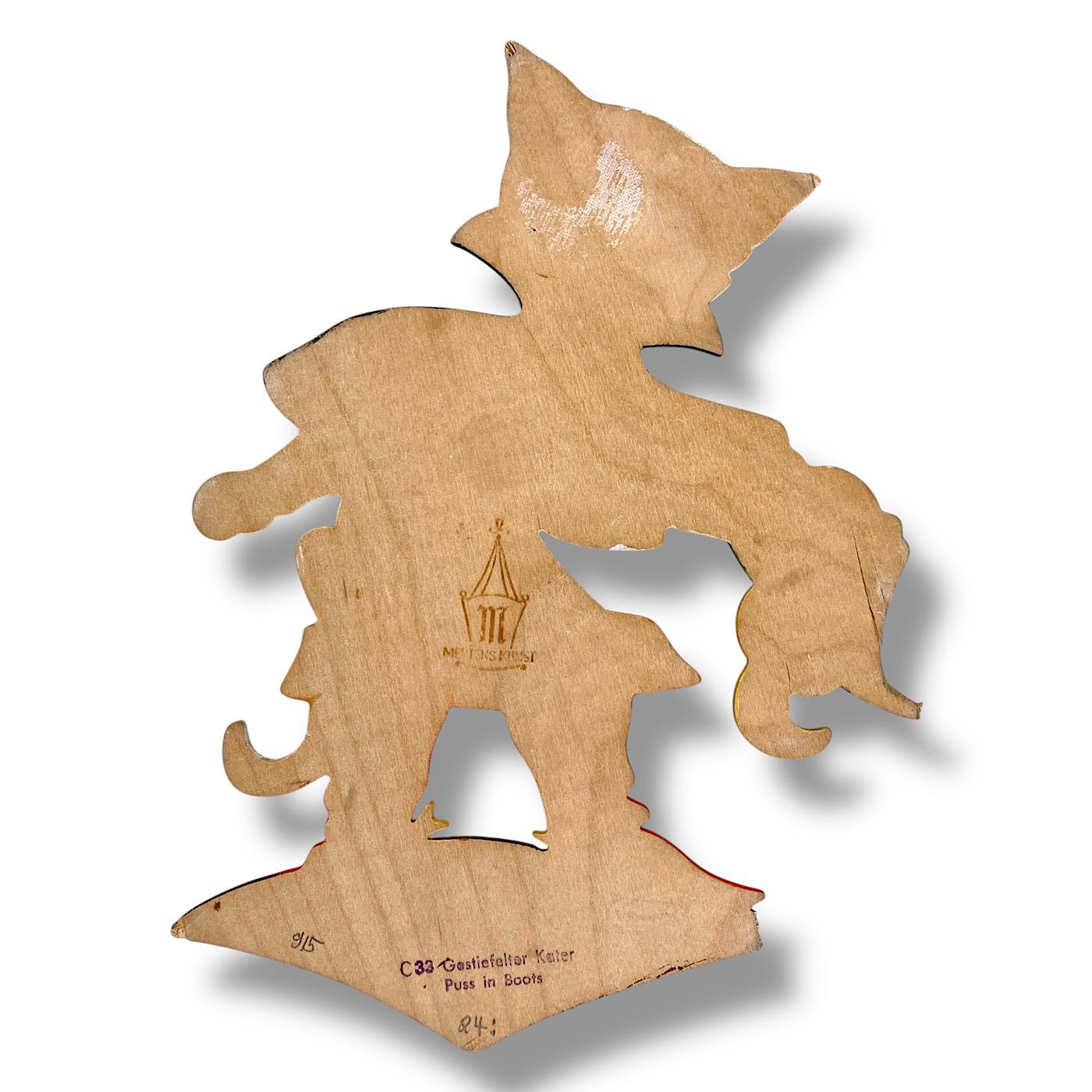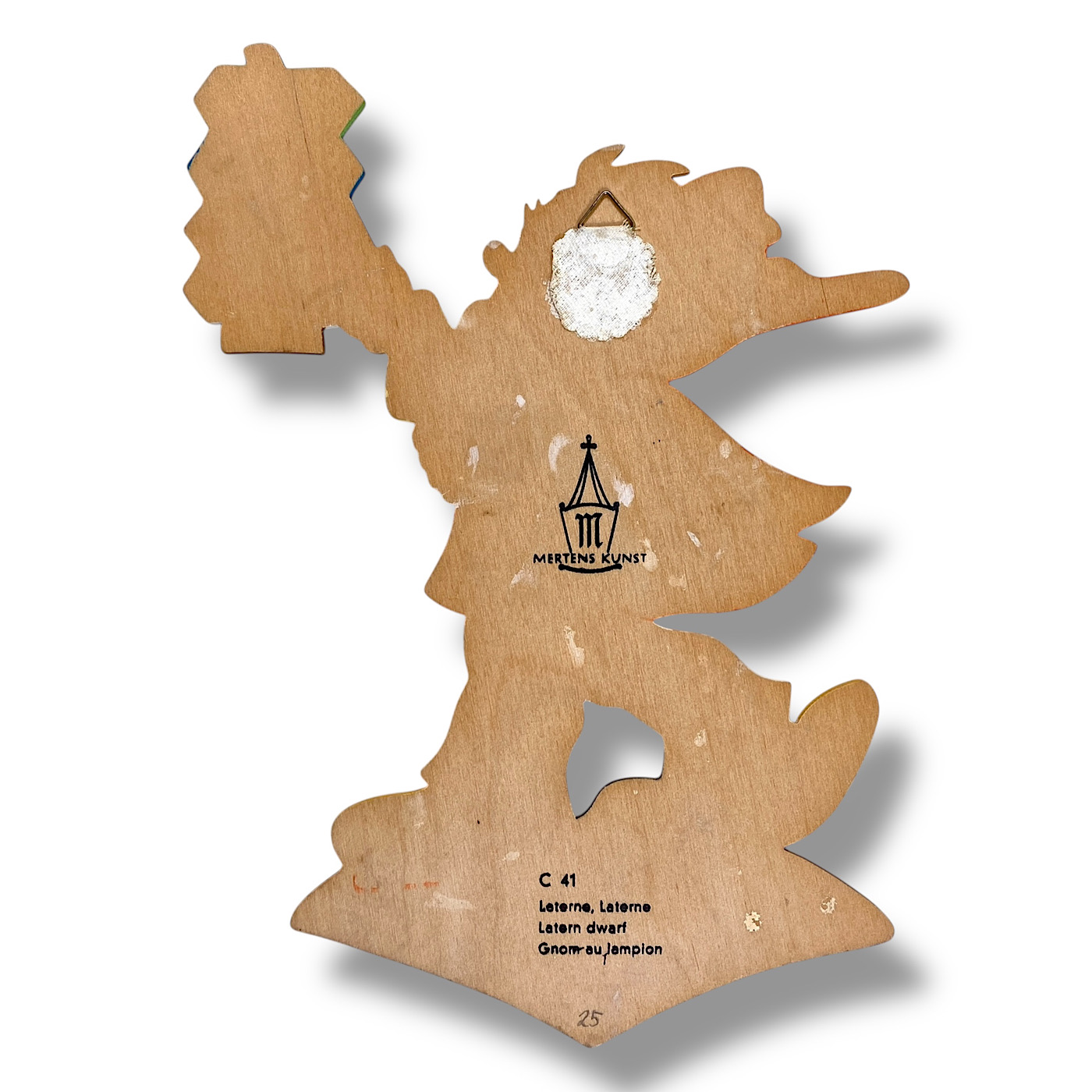 🇬🇧 MERTENS, ERAS: You can divide the German Wall Figures by Alfred Mertens into antique, mid-century, and vintage. The antique wood plaques are from the 1930s and completely hand-painted. Some of them also include elements of Art Nouveau and Art Deco style—for example, the early Seven Ravens sister with the hairband. Around the middle of the last century, the figures became smaller due to the material shortages during the Second World War. Most of the 1940s wood plaques were still entirely hand-painted. By the 1950s, however, Mertens-Kunst began printing the slim base shapes—faces, hands, and outlines—while the rest of the figure was still painted by hand, including the edges. The vintage wall figures were fully screen-printed, roughly from the 1960s to the 1980s, when the very last fairy tale motifs were designed by Mertens-Kunst. (Buch/25)