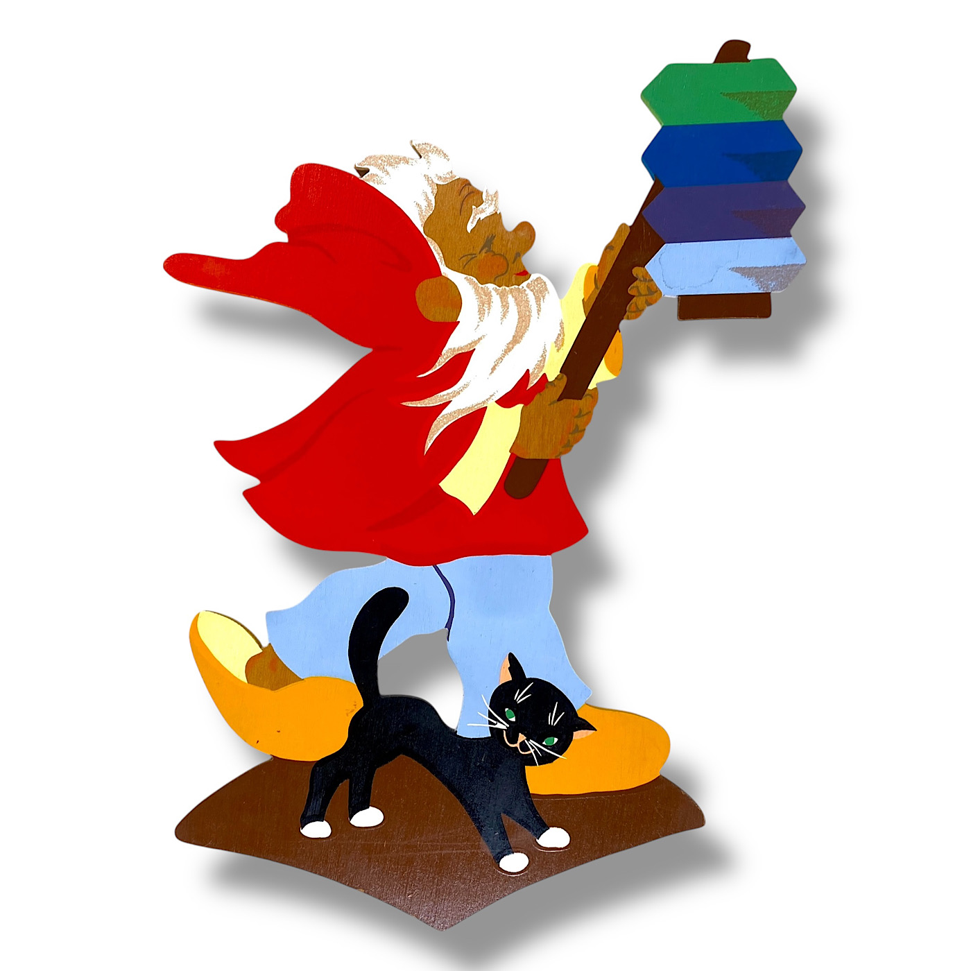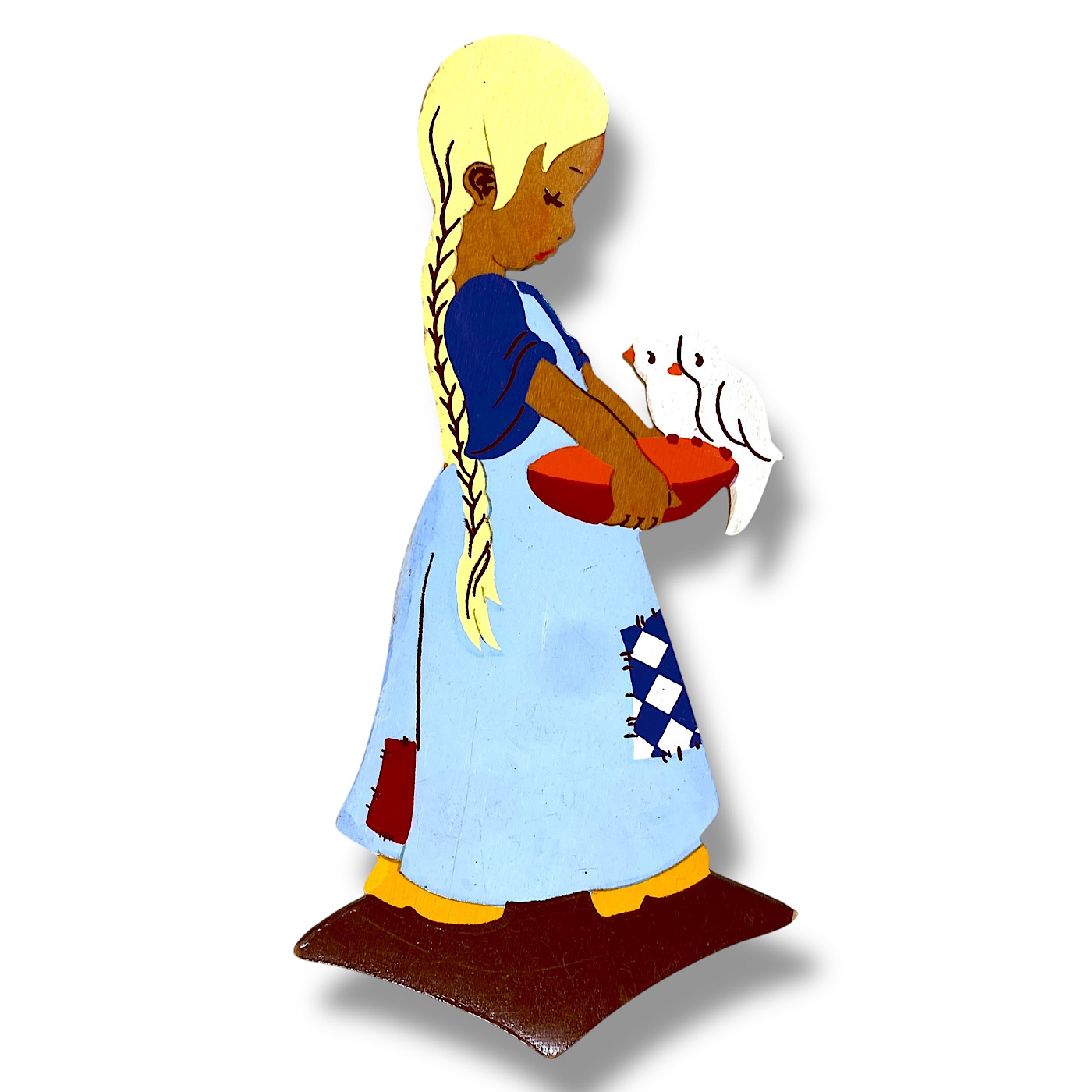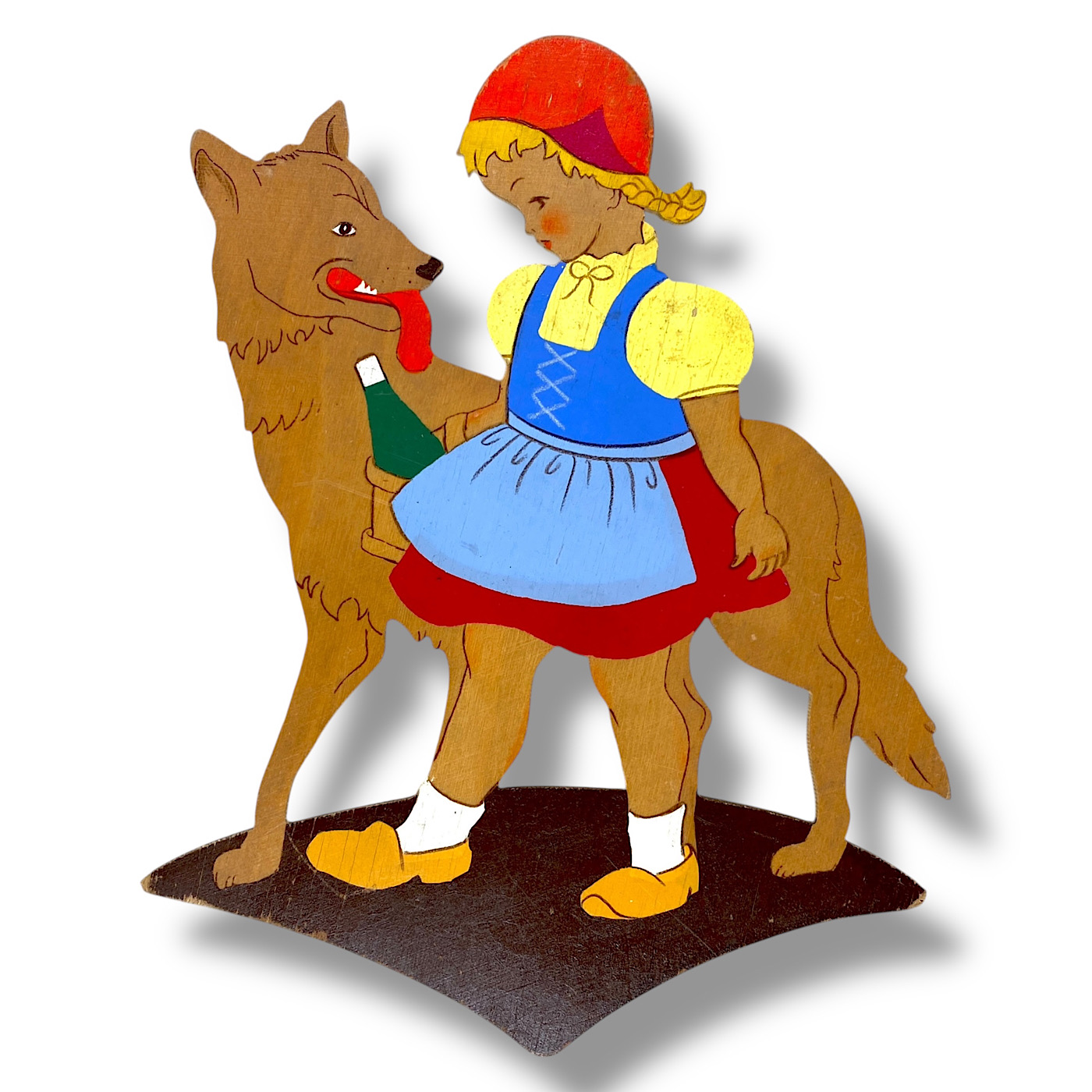 1940er Holz-Wandfigur, Mertens-Kunst Märchen 20cm Wolfs-Rotkäppchen mit fliegenden Zöpfen und gelber Bluse 🇬🇧 Midcentury Wooden Wall Figure, Alfred Mertens Fairy Tale 20cm Little Red Riding Hood with Wolf and Yellow Blouse