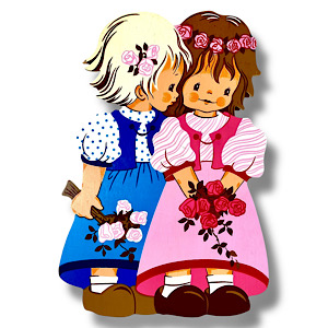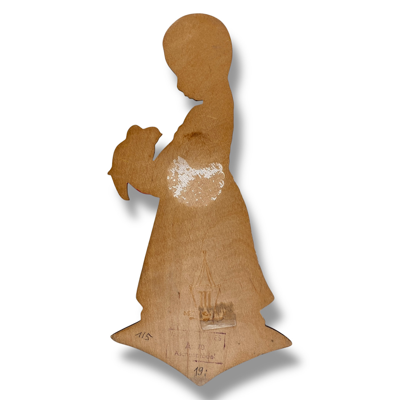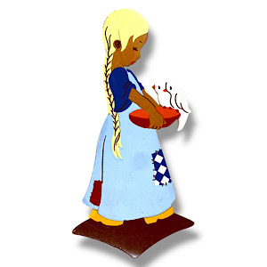 MERTENS, EPOCHEN: Man kann die Holzbilder von Alfred Mertens in Antik, Jahrhundertmitte und Vintage einteilen. Die antiken Figuren aus den 1930er-Jahren waren komplett handbemalt und hatten teilweise noch Elemente vom Jugendstil oder auch Art Deco Stil. Beispiel: das frühe Sieben-Raben-Schwesterchen mit Haarreif. In der Jahrhundertmitte wurden die Figuren kleiner, was mit dem Materialmangel im Zweiten Weltkrieg zusammenhing und später beibehalten wurde. Die Figuren aus den 1940er-Jahren sind zum größten Teil noch handbemalt, aber spätestens in den 1950er-Jahren begann Mertens-Kunst, die schmalen Grundformen (Gesichter, Hände, Umrisse) aufzudrucken, während der Rest der Figur noch handbemalt wurde – auch die Seitenränder. Zu den Vintage-Figuren zählen all die Holzbilder, die schon vollständig im Siebdruckverfahren hergestellt worden sind – ungefähr ab den 1960er- bis zu den 1980er-Jahren, als schließlich die allerletzten Kinder-Wandfiguren von Mertens erschienen.