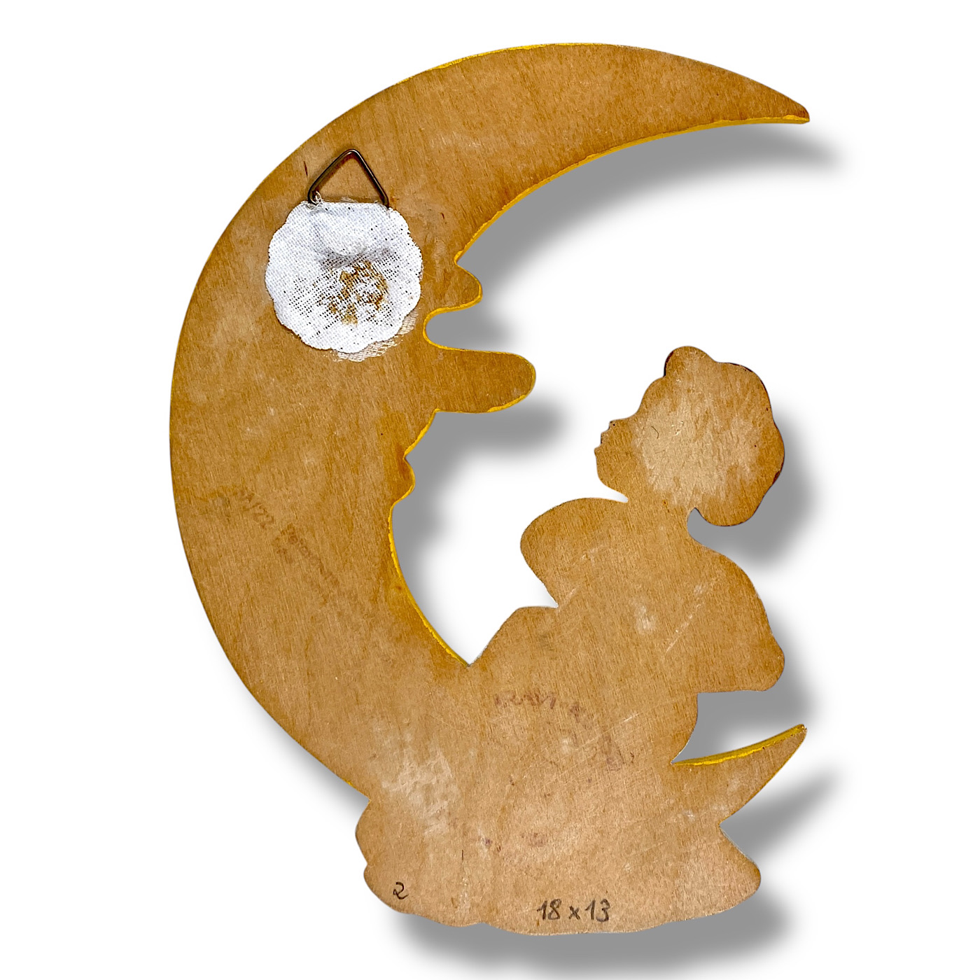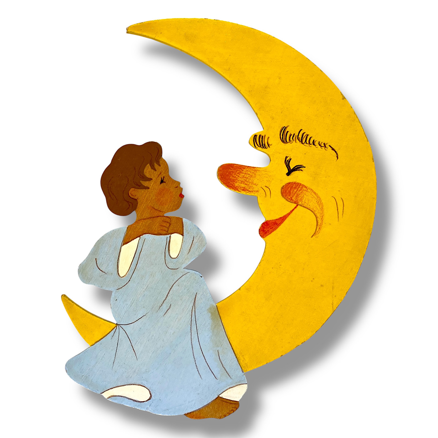 1950er Ravi-Kunst: Peterchens Mondfahrt im hellblauen Nachthemd, Handbemalt, 18x13cm, Märchen-Holzbild 🇬🇧 Midcentury Ravi-Kunst: Little Peter’s Journey to the Moon in Light Blue Night Dress, 18x13cm, Hand-painted, German Wall Figure
