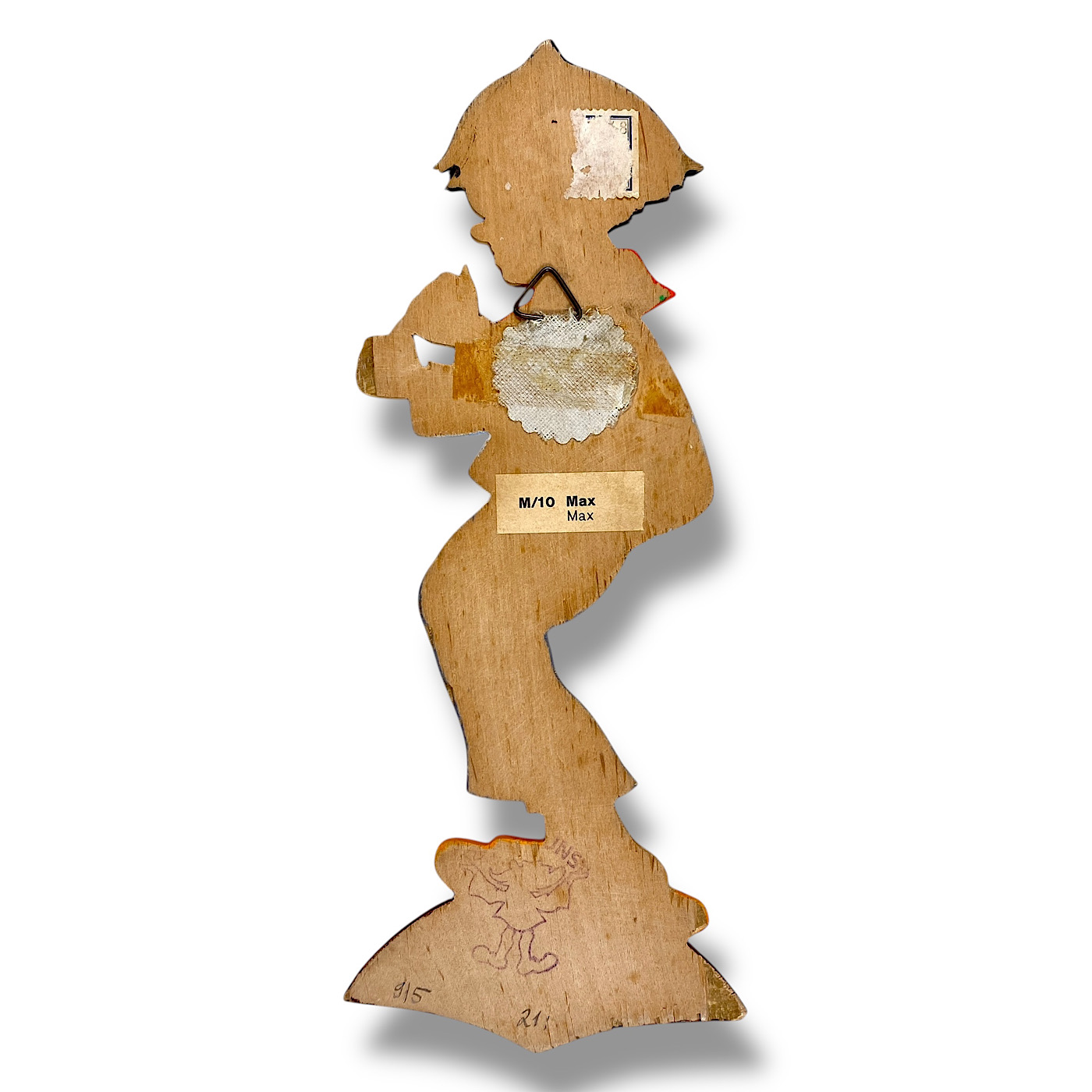 🇬🇧 MAX AND MORITZ: The two Wilhelm Busch troublemakers were very popular in the last century as fretsaw figures, especially among boys. The templates came, for example, from Johannes Graupner/Graubele, who produced many of the seven pranks as pre-printed fretsaw boards to be cut out. In addition to those hobby pieces, there were also some professionally made wall figures—for example by Mertens and Original Bergischer Engel. However, these are rather rare as children’s wall plaques; the motif was far more frequently used on jumping jack figures. The rarest wall figure undoubtedly comes from Original Bergischer Engel, as it exists only as a hand-painted sample that was never published: The figure shows Max and Moritz inside a sack, their legs sticking out, and the miller carrying them to the mill—and thus to their death. (Buch/25)