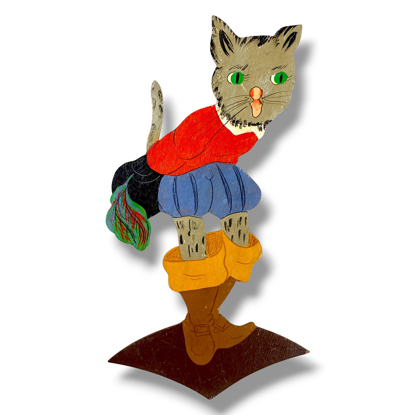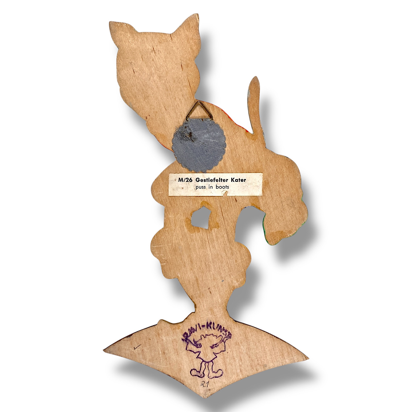 1940er Holz-Wandfigur, Ravi-Kunst, Märchen 21cm Früher Gestiefelter Kater in Pumphosen, Handbemalt 🇬🇧 1940s Wooden Wall Figure, Ravi-Kunst, Fairy Tale 21cm Early Puss in Boots with Puffed Trousers, Hand-painted