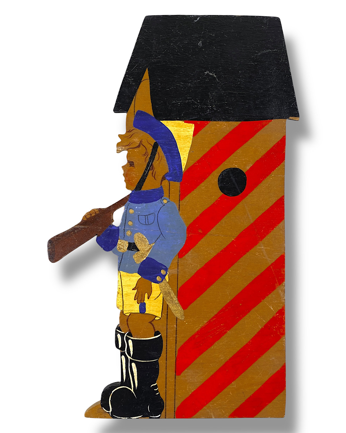 1930er Märchen-Holzbild (Kind): Soldatenjunge mit Gewehr und Wachhäuschen, Niedersachsen-Kunst