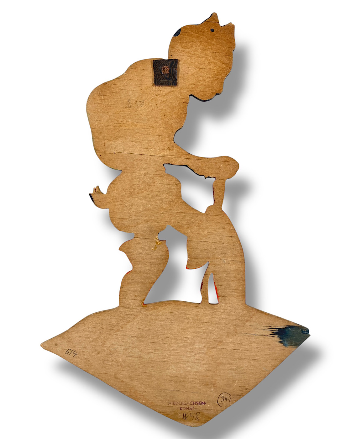 NIEDERSACHSEN-KUNST: Dieser Hersteller hat in den 1930er und vielleicht auch noch in den frühen 1940er Jahren Märchen-Holzbilder produziert, aber auch Kindermotive und Zwerge. Sie wurden alle handbemalt. Auf vielen der Figuren kann man unten ein Grasbüschel sehen, und die Augen wurden mit braunem Bleistift gezeichnet, wie das auch bei Heller der Fall war. Vielleicht wurde die Werkstatt im Zweiten Weltkrieg ausgebombt? Ich kenne jedenfalls keine späteren Produkte dieses Herstellers. Weiß jemand mehr über Niedersachsen-Kunst? Bitte schreiben Sie mir! (Aus dem Buch: Die Ära der Märchen-Holzbilder, Vintage German Wall Figures, 2025, Christiane Dietz)