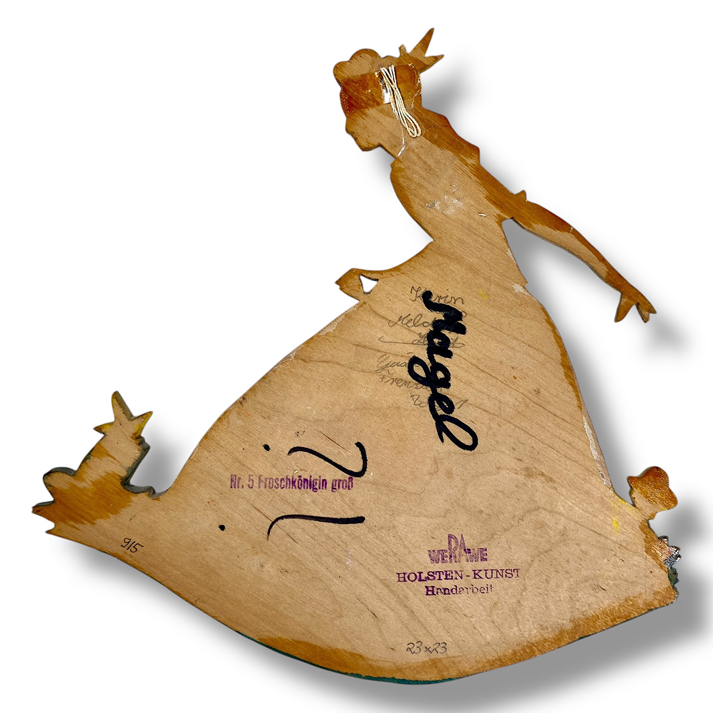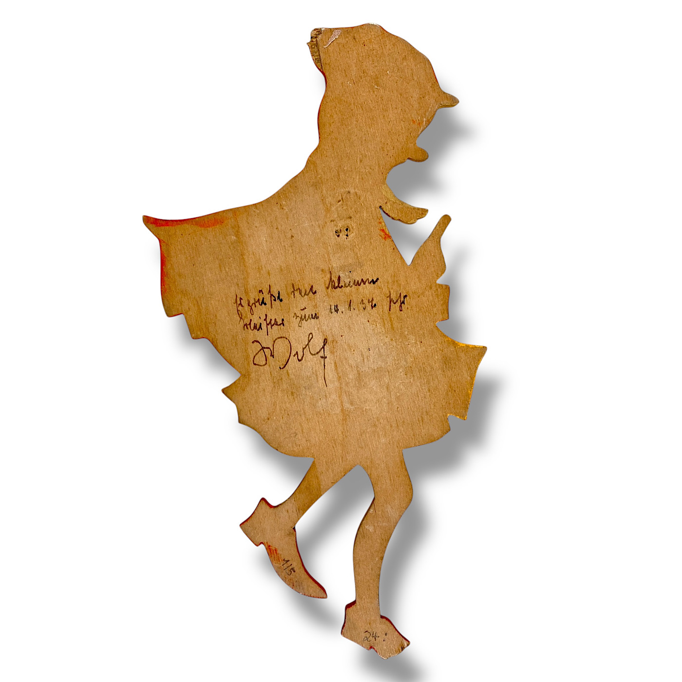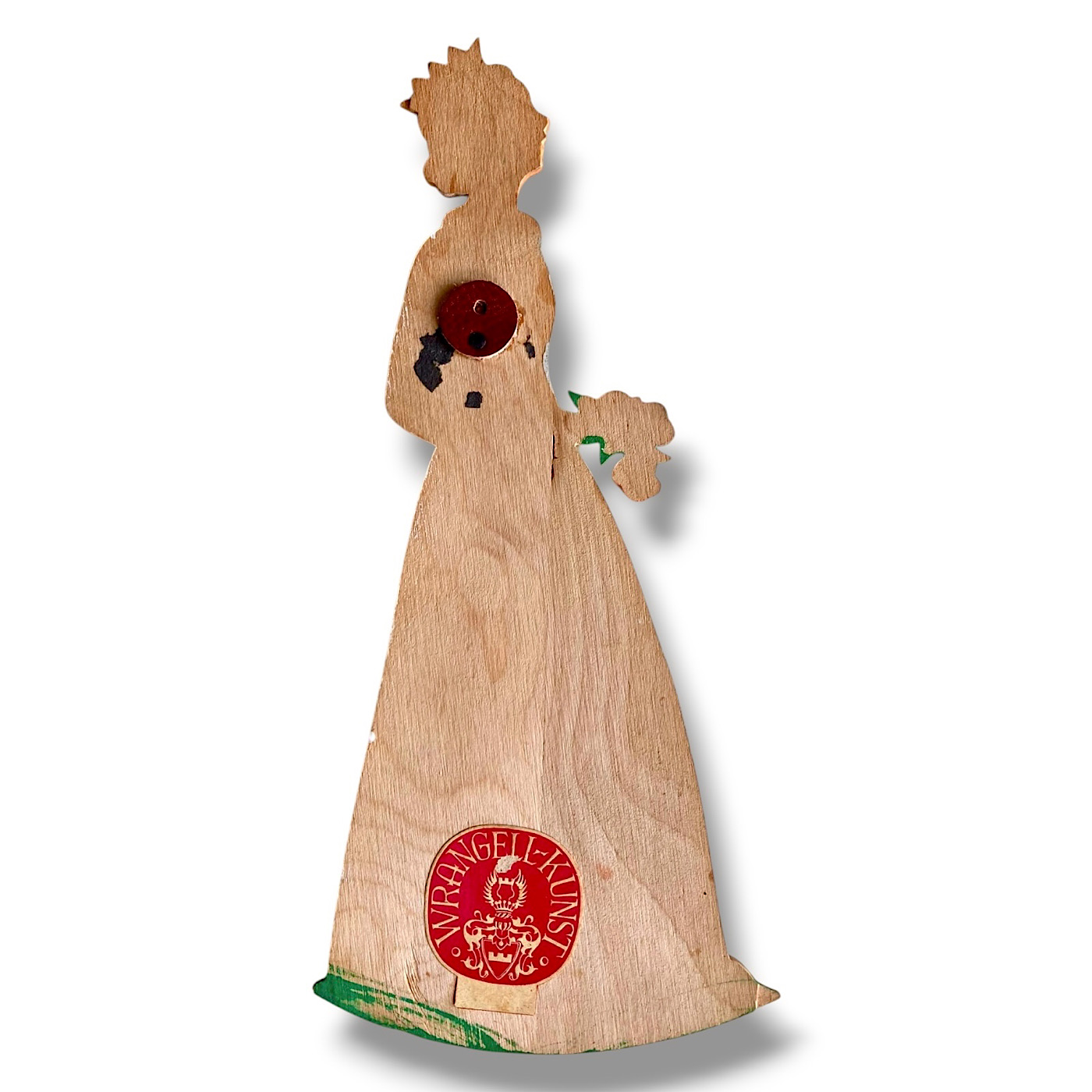 WRANGELL / WRANGEL, COMPANY HISTORY: Ingela Storhas, the grandniece of Karin von Wrangell, kindly shared information about her late great-aunt in several emails. She wrote on August 23, 2018: “Karin von Wrangell, born July 30, 1900 in Alp (Estonia), died June 20, 1979 in Schielberg near Bad Herrenalb. Company history: In 1920/21, she trained as a kindergarten teacher and handicraft instructor at the Pestalozzi-Froebel-Haus in Berlin. She started an arts and crafts workshop at her home in Berlin. In 1930, she moved to Lindau and set up a new workshop for fairy tale figures in Lindau-Reutin with several employees, with involvement from Professor Gollwitzer. Her sister (Ingeborg) represented the company at the Leipzig Trade Fair; there were international exports. As of 1933, all foreign orders were cancelled. In 1936, their father died. The company was relocated to Stuttgart. In 1944, a bombing raid completely destroyed their home and workshop. Her sister suffered a phosphorus poisoning. Karin and her mother found alternative accommodation in Freiburg. In 1947, they attempted to revive the business in Welzheim with the help of a general sales representative. Karin provided the designs. Perhaps that’s when the other logo ‚Wrangel-Kunst‘ was created. Among other things, so-called fairy tale boxes were designed and produced. These included the key characters of a fairy tale, cut out of wood in relief, to be set up as a scene. They were packed in boxes of about 15 x 15 cm. In 1948, Karin fell seriously ill and had to stay in the hospital for several weeks. The business filed for bankruptcy. After that, no more wooden figures were produced. Alongside, Karin continued to train as a painter and a sculptural artist.Later, she worked as a portrait painter until the end of her life. I myself, apart from a few small Christmas tree figures from the very earliest period, do not own any wooden wall figures by her. However, I do own several other works from her very diverse creative output. I hope I have been able to give you a closer impression of my aunt with this information. It was obviously a sign of the times that one had to make ends meet somehow – even if one’s real talent lay elsewhere. With kind regards, Yours, Ingela Storhas-von Wrangell.”