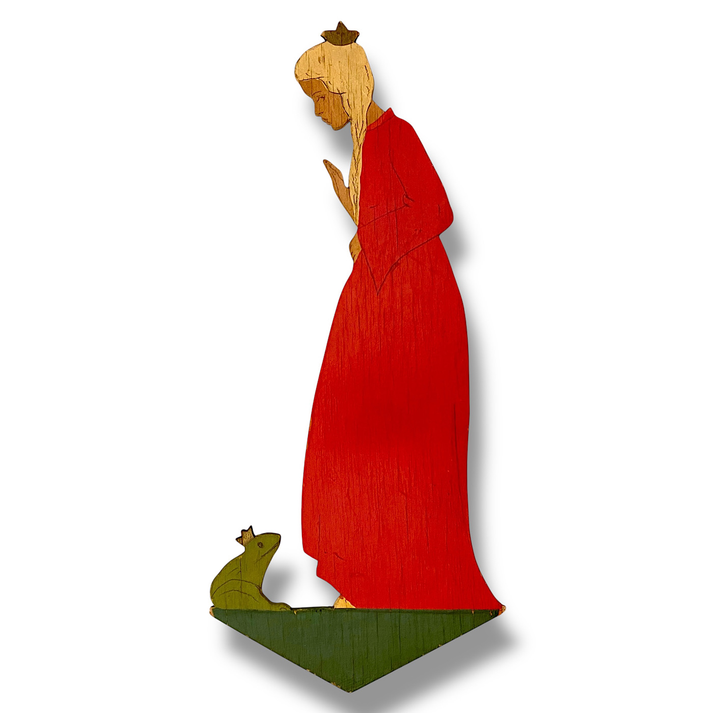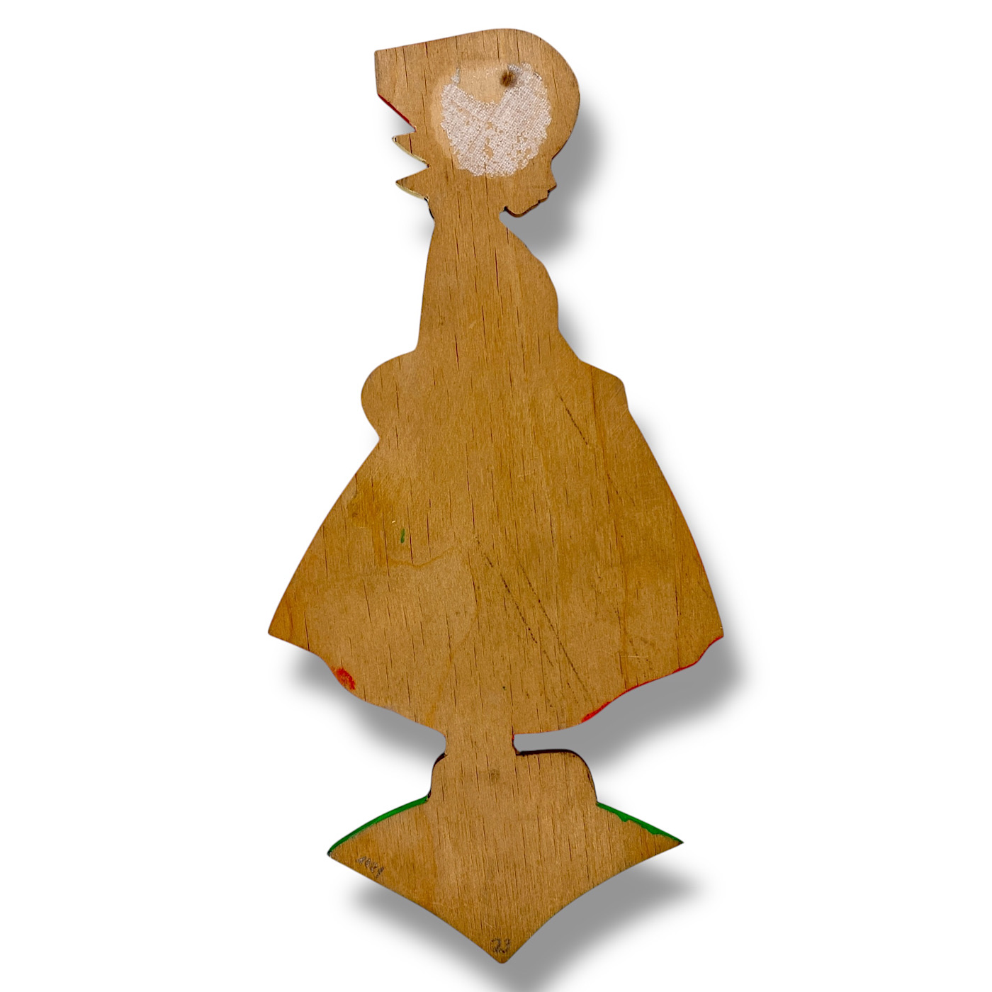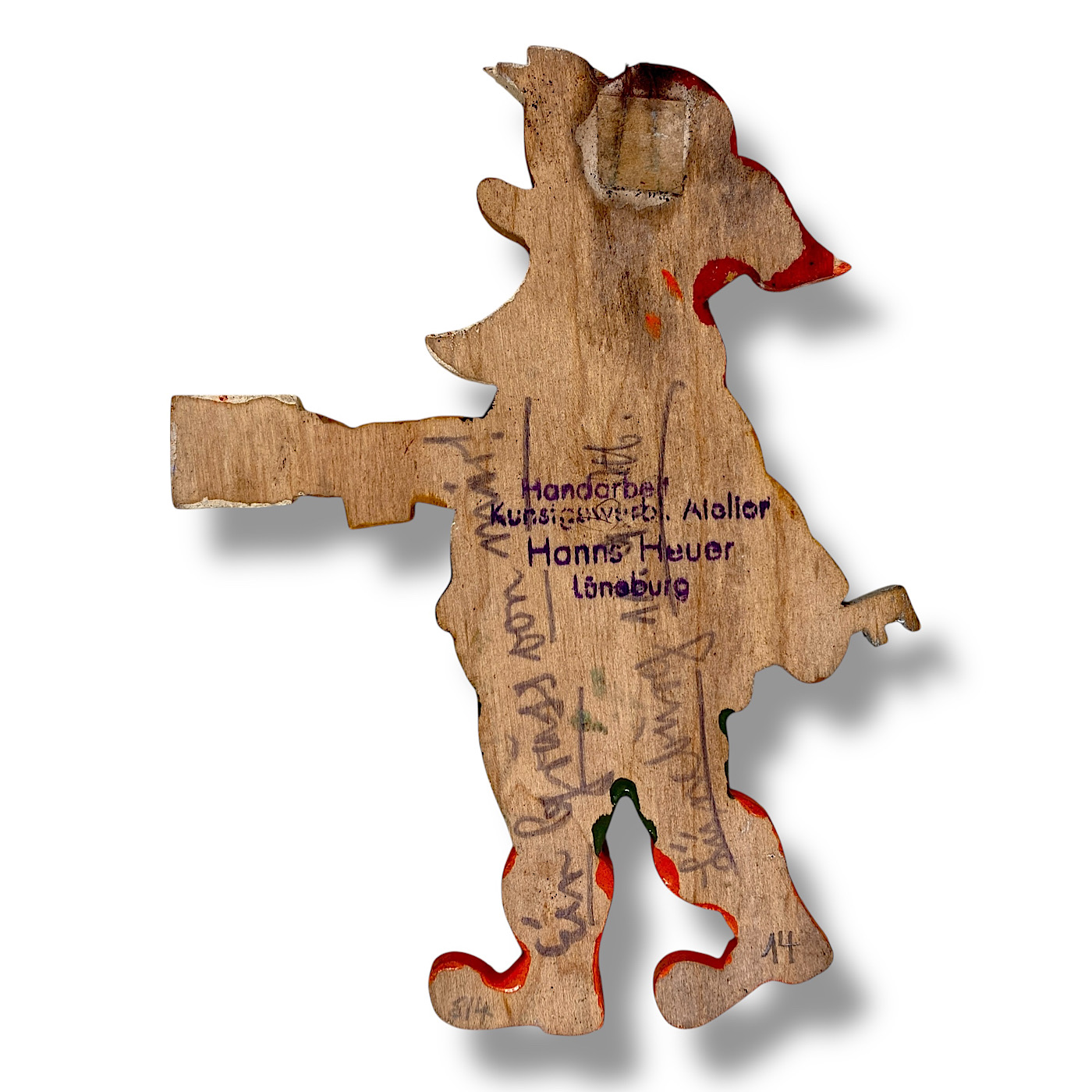 WRANGELL / WRANGEL, COMPANY HISTORY: Ingela Storhas, the grandniece of Karin von Wrangell, kindly shared information about her late great-aunt in several emails. She wrote on August 23, 2018: “Karin von Wrangell, born July 30, 1900 in Alp (Estonia), died June 20, 1979 in Schielberg near Bad Herrenalb. Company history: In 1920/21, she trained as a kindergarten teacher and handicraft instructor at the Pestalozzi-Froebel-Haus in Berlin. She started an arts and crafts workshop at her home in Berlin. In 1930, she moved to Lindau and set up a new workshop for fairy tale figures in Lindau-Reutin with several employees, with involvement from Professor Gollwitzer. Her sister (Ingeborg) represented the company at the Leipzig Trade Fair; there were international exports. As of 1933, all foreign orders were cancelled. In 1936, their father died. The company was relocated to Stuttgart. In 1944, a bombing raid completely destroyed their home and workshop. Her sister suffered a phosphorus poisoning. Karin and her mother found alternative accommodation in Freiburg. In 1947, they attempted to revive the business in Welzheim with the help of a general sales representative. Karin provided the designs. Perhaps that’s when the other logo ‚Wrangel-Kunst‘ was created. Among other things, so-called fairy tale boxes were designed and produced. These included the key characters of a fairy tale, cut out of wood in relief, to be set up as a scene. They were packed in boxes of about 15 x 15 cm. In 1948, Karin fell seriously ill and had to stay in the hospital for several weeks. The business filed for bankruptcy. After that, no more wooden figures were produced. Alongside, Karin continued to train as a painter and a sculptural artist.Later, she worked as a portrait painter until the end of her life. I myself, apart from a few small Christmas tree figures from the very earliest period, do not own any wooden wall figures by her. However, I do own several other works from her very diverse creative output. I hope I have been able to give you a closer impression of my aunt with this information. It was obviously a sign of the times that one had to make ends meet somehow – even if one’s real talent lay elsewhere. With kind regards, Yours, Ingela Storhas-von Wrangell.”