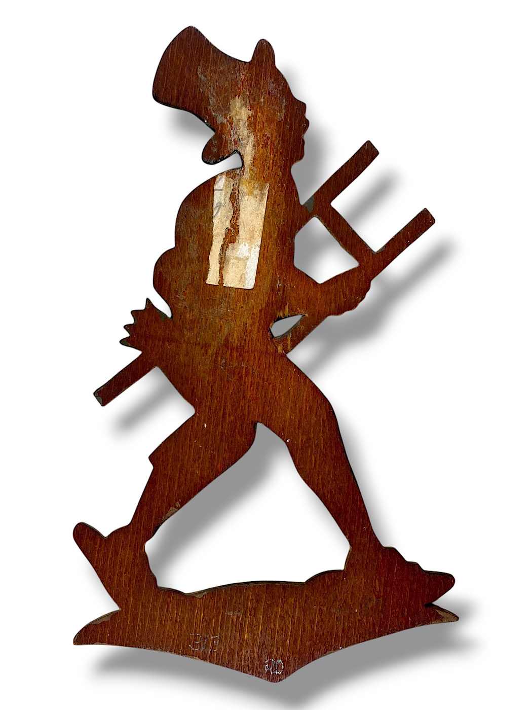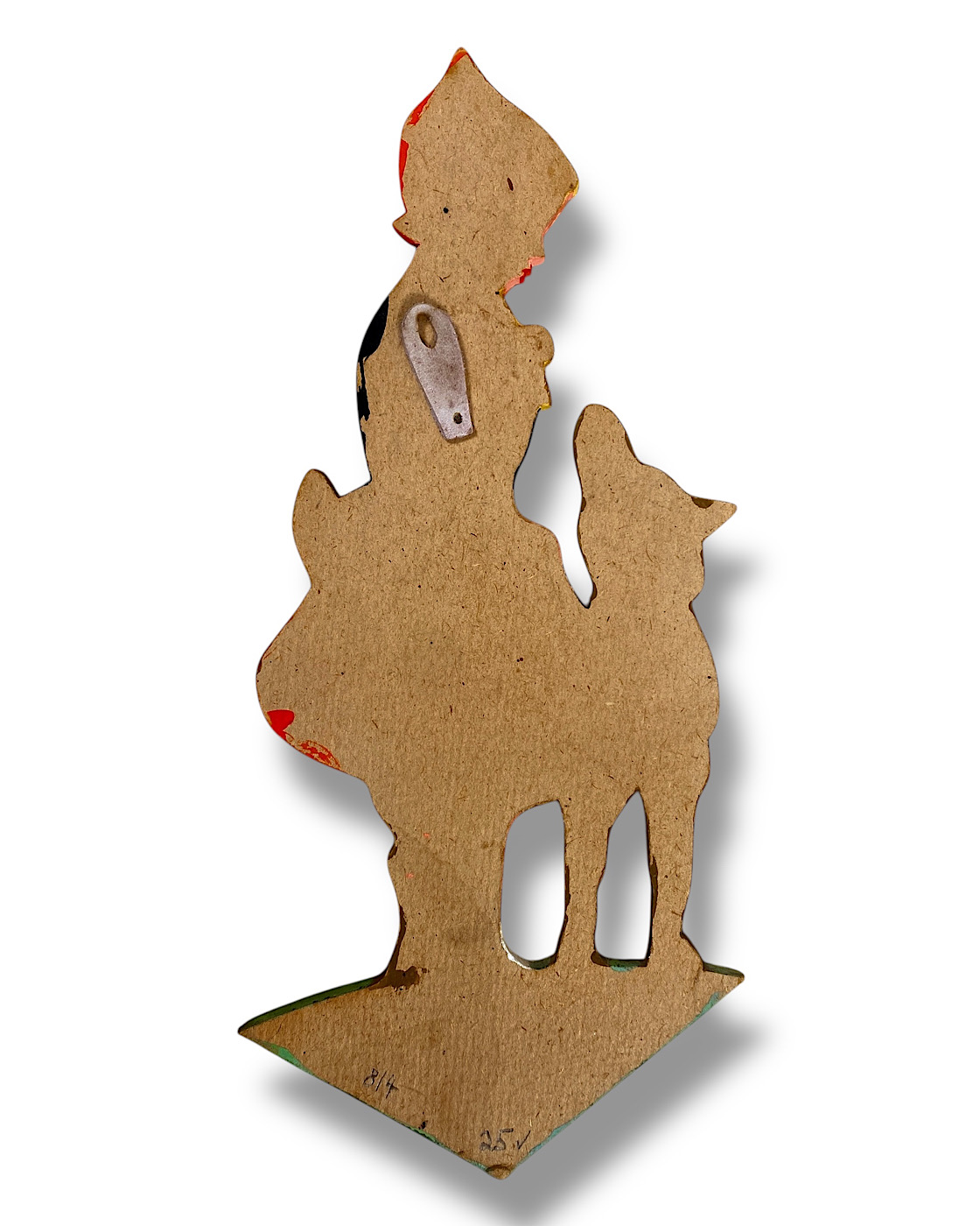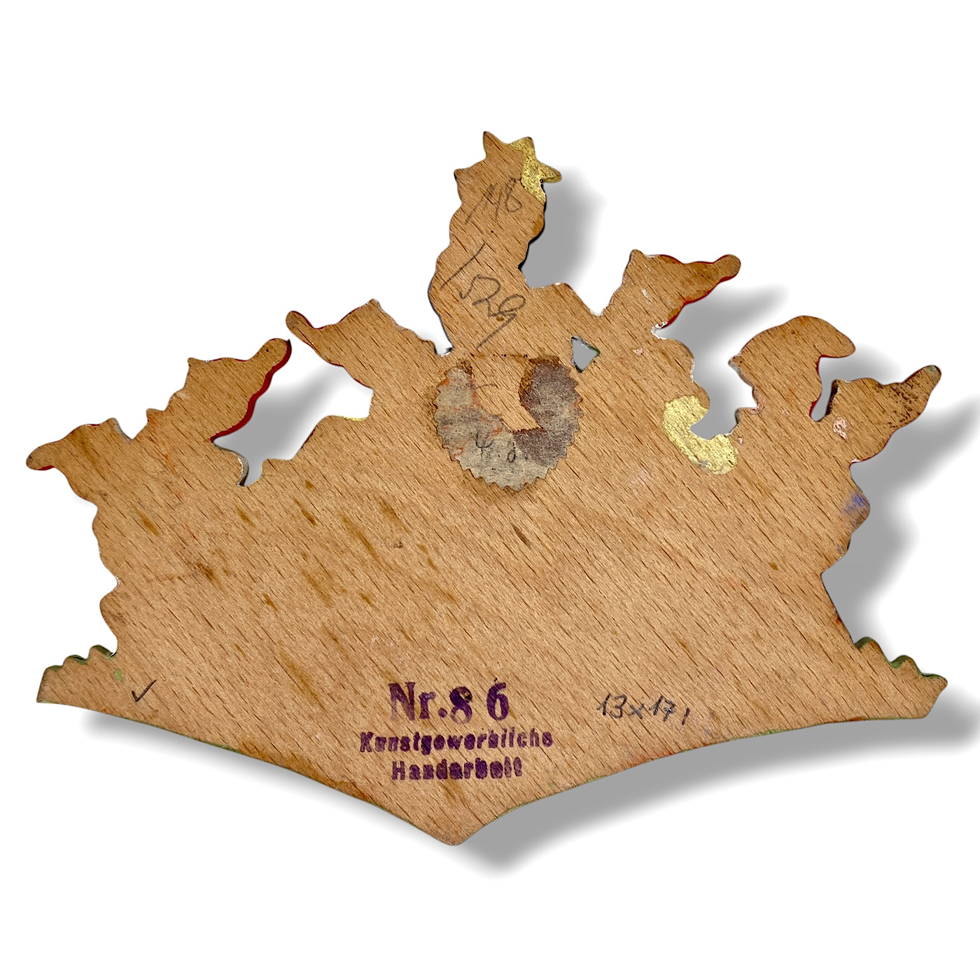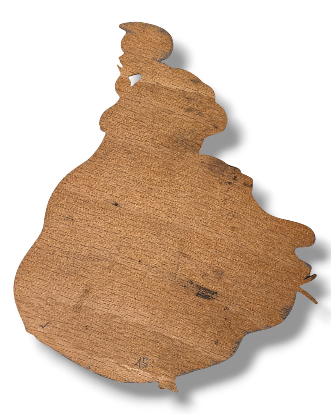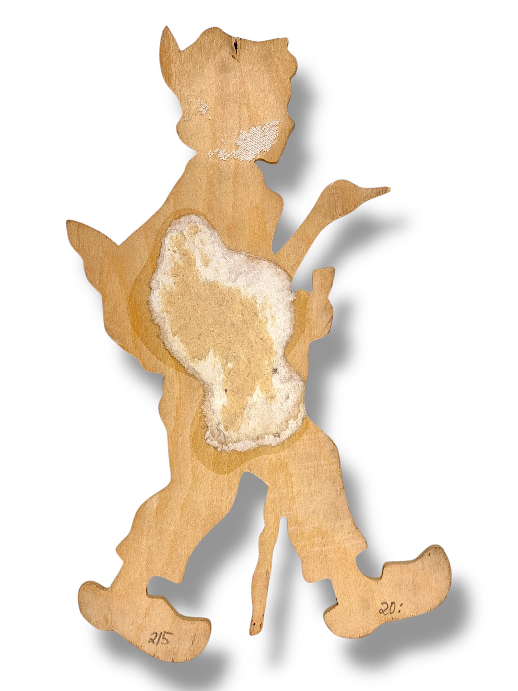 🇬🇧 KUNSTGEWERBLICHE HANDARBEIT: On the back of these historical and mostly rather small German Wall Figures, they almost always stamped “Kunstgewerbliche Handarbeit,” meaning handmade arts and crafts. And there was a motif number, too, abbreviated as “No.” That’s why I also call it the “Unknown No Series.” They were probably produced in the 1930s and 1940s, although during the Second World War, cardboard was apparently used instead of wood—presumably due to the material shortages during wartime. That happened to other producers, too. This manufacturer also made many tiny place card stands in the same style. Does anyone know the correct name of the manufacturer? Please get in touch! (From the Book: Vintage German Wall Figures, Die Ära der Märchen-Holzbilder, 2025, Christiane Dietz)