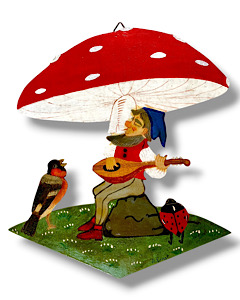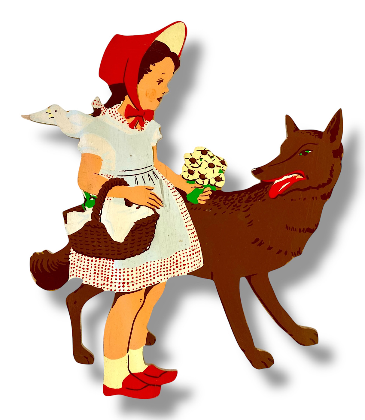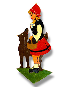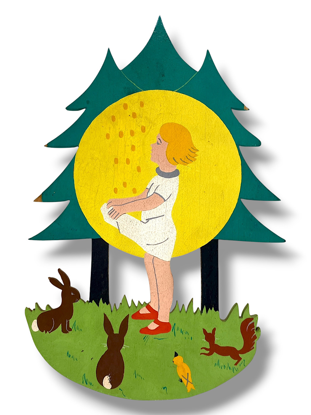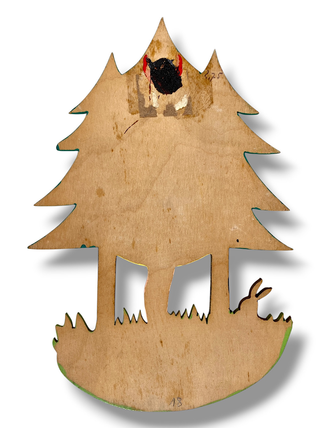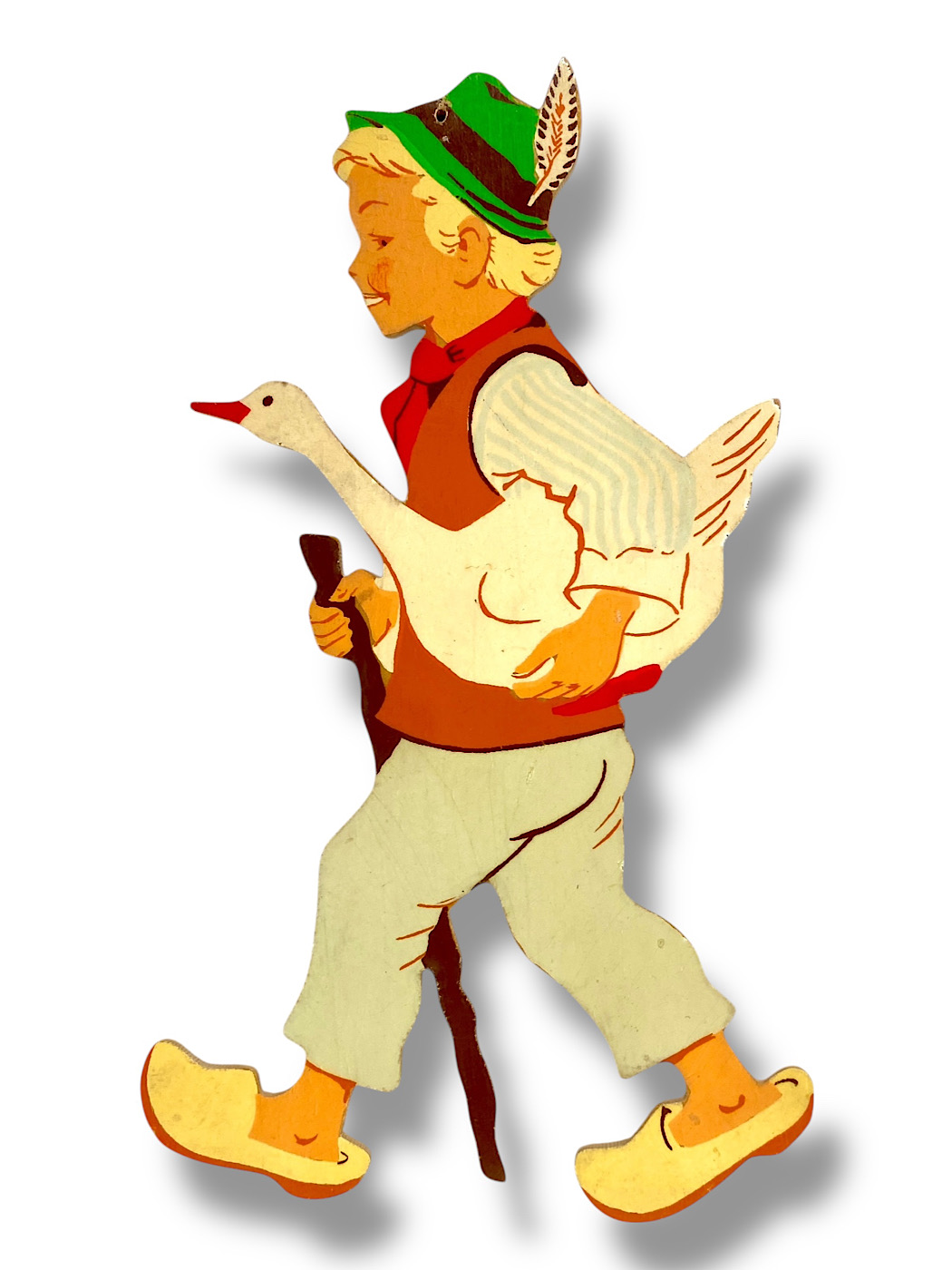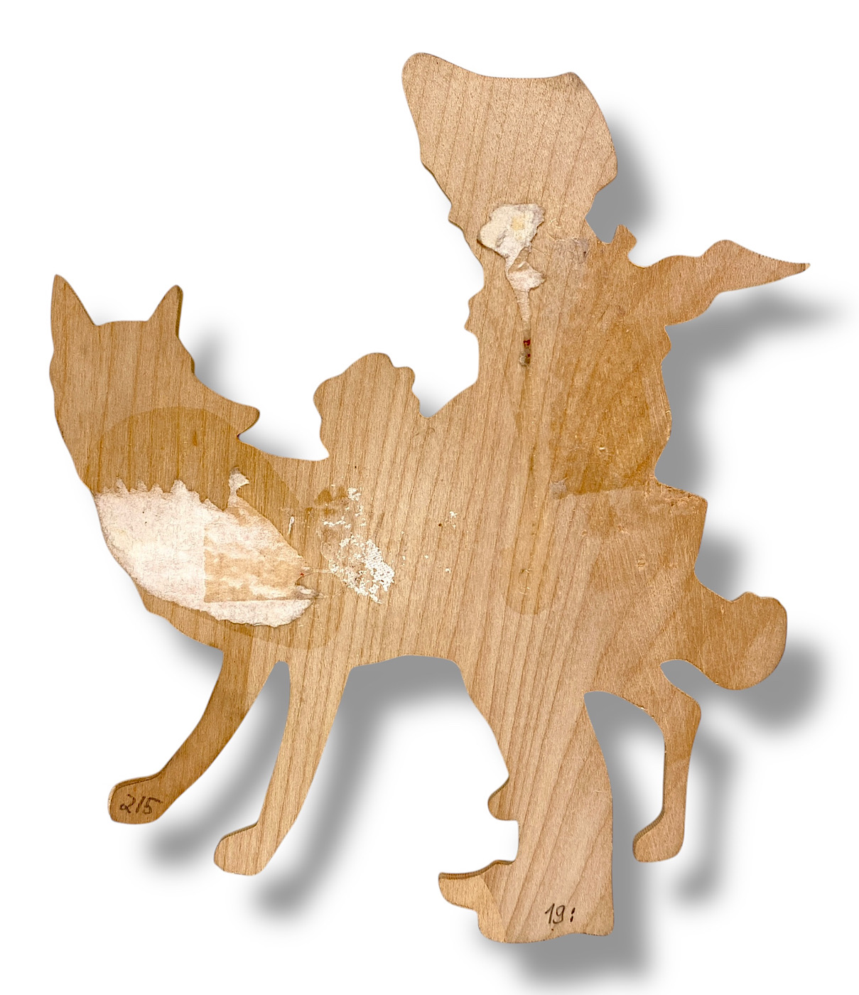 KUNSTGEWERBLICHE HANDARBEIT: Auf der Rückseite dieser historischen und meist eher kleinen Märchen-Holzbilder steht fast immer „Kunstgewerbliche Handarbeit“ und eine Motivnummer, die mit „No“ abgekürzt ist. Deshalb nenne ich sie auch die „Unbekannte No-Serie“. Produziert wurde wohl in den 1930er- und 1940er-Jahren, wobei während des Zweiten Weltkriegs offenbar auf das Material Pappe umgestiegen wurde – vermutlich war das Holz in der Kriegszeit knapp geworden. Das ging damals vielen Herstellern so. Diese Manufaktur hat auch sehr viele kleine Tischkartenhalter im gleichen Stil hergestellt. Weiß jemand den richtigen Namen des Herstellers? Bitte schreiben Sie mir! (Aus dem Buch: Die Ära der Märchen-Holzbilder, Vintage German Wall Figures, 2025, Christiane Dietz)