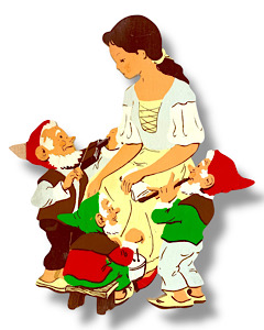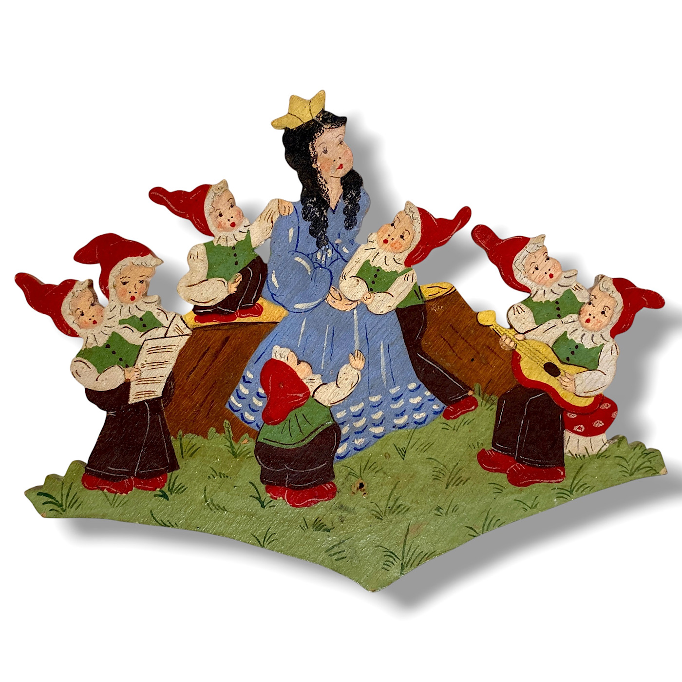 1930er Kunstgewerbliche Handarbeit: Kleines Schneewittchen und die sieben Zwerge, Handbemalt 13x17cm 🇬🇧 Small Snow White and the 7 Dwarfs (Märchen-Holzbild, German Wall Figure) *
