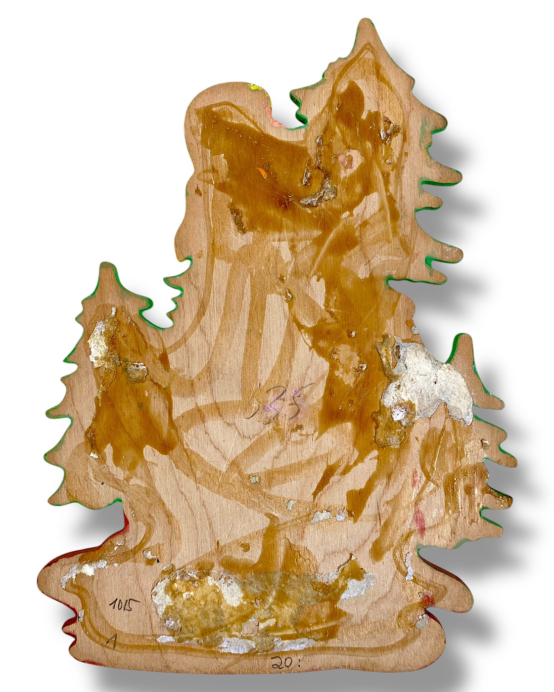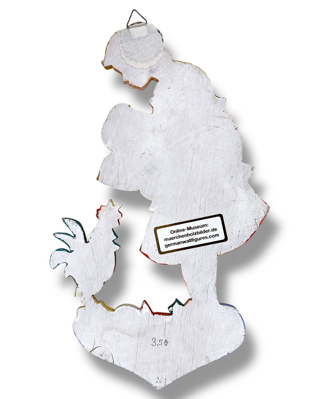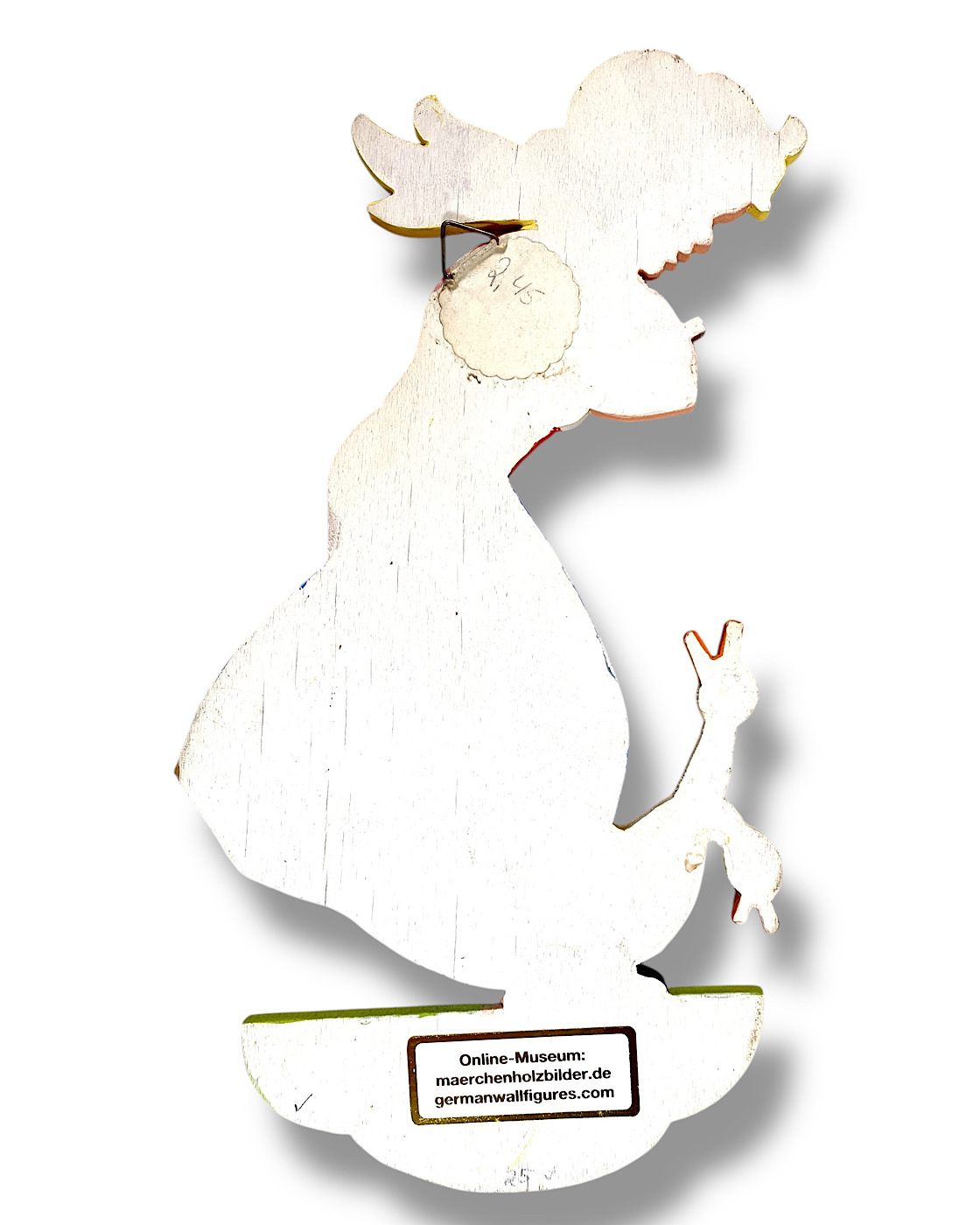 RIE-BILDER: Die „Rie-Bilder“ waren vermutlich späte Figuren der Münchner-Kunst, aus den 1960er und 1970er Jahren. Sie sind größer, aus dickerem Holz und haben eine geweißte Rückseite. Auf einigen findet man folgenden Stempel: „Rie-Bilder ges. gesch.“ Manche Motive sind fast gleich, zum Beispiel die rote Froschkönig-Prinzessin auf blauem Herz-Sockel: In den 1950er-Jahren 17 cm klein, als Rie-Bilder 27 cm groß. Die Größe, das dicke Holz sowie der halbrunde Wiesen-Sockel erinnern an die frühen „Münchner Kinder-Wandbilder“ aus den 1930er-Jahren. War es ein „Back to the Roots“? Der Name „Rie-Bilder“ könnte von „Riederer“ kommen; die Manufaktur wurde in den 1950er und 1960er Jahren von Gerhard Jaeger und Josef Riederer geführt. Die späteren Besitzer der Münchner-Kunst hießen anders: Emil Knies und danach E. Hübner. Die Abmeldung war am 4.12.1981. (Aus dem Buch: Die Ära der Märchen-Holzbilder, Vintage German Wall Figures, 2025, Christiane Dietz)