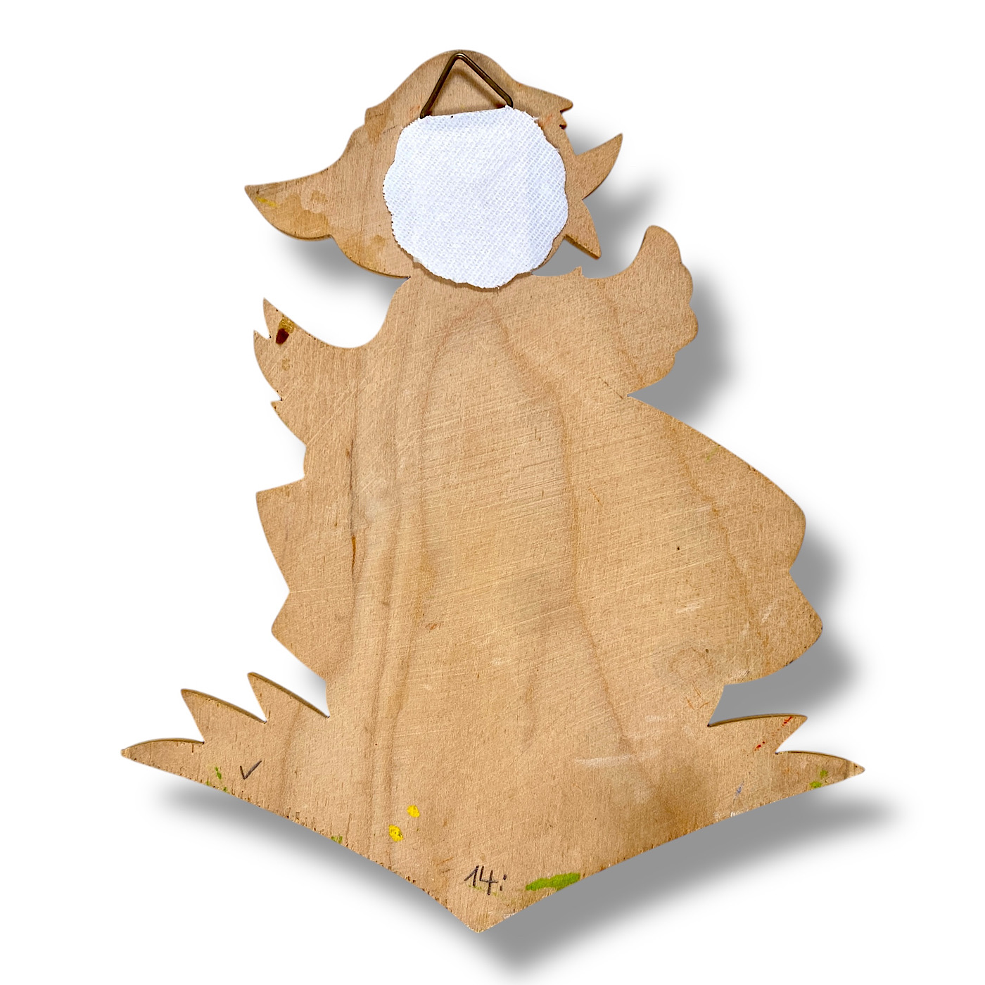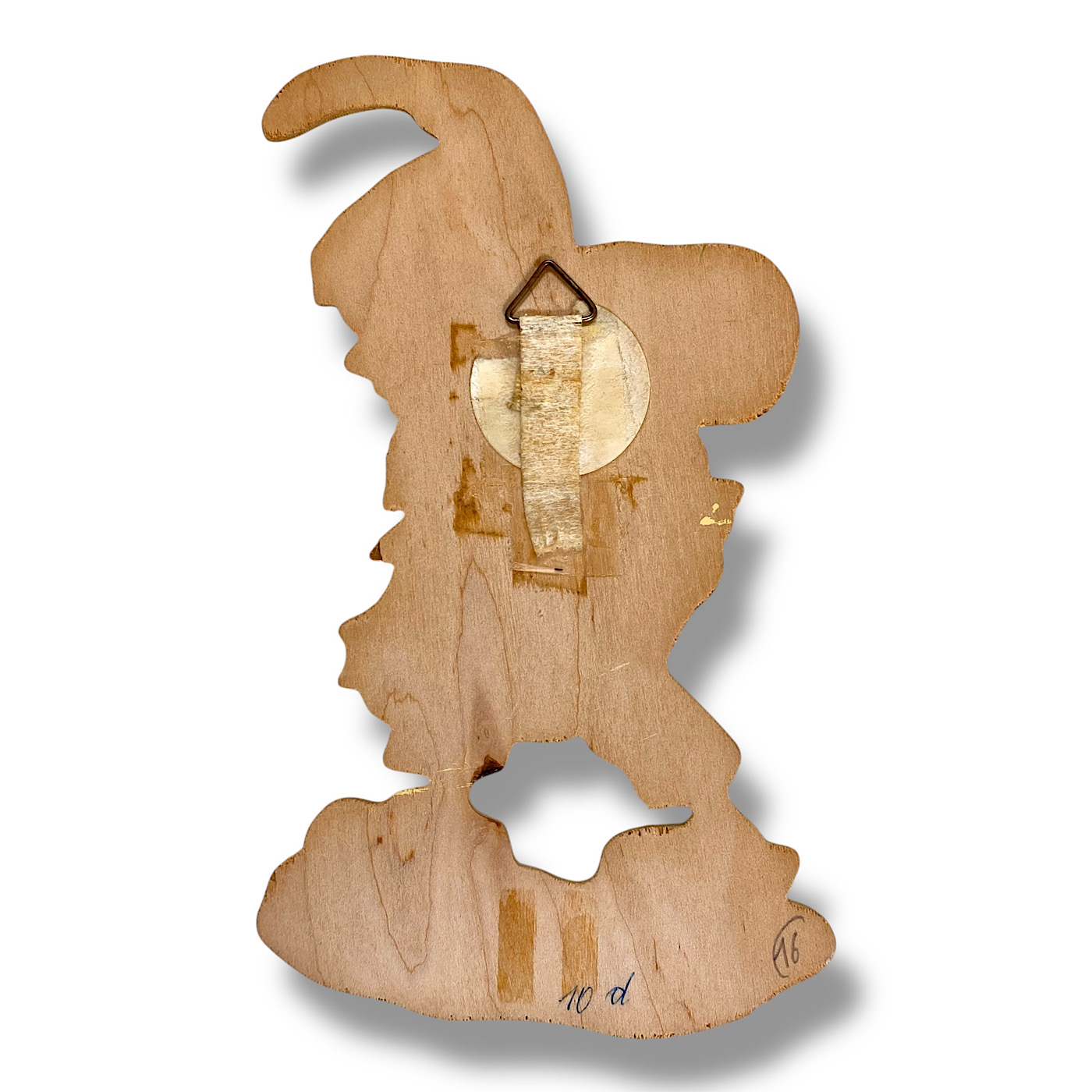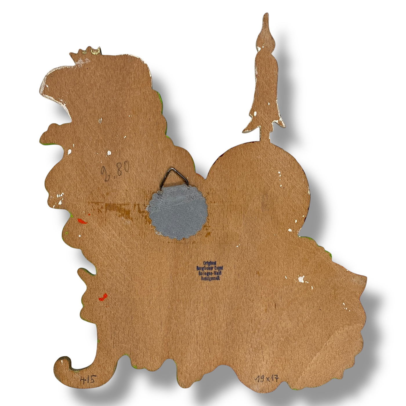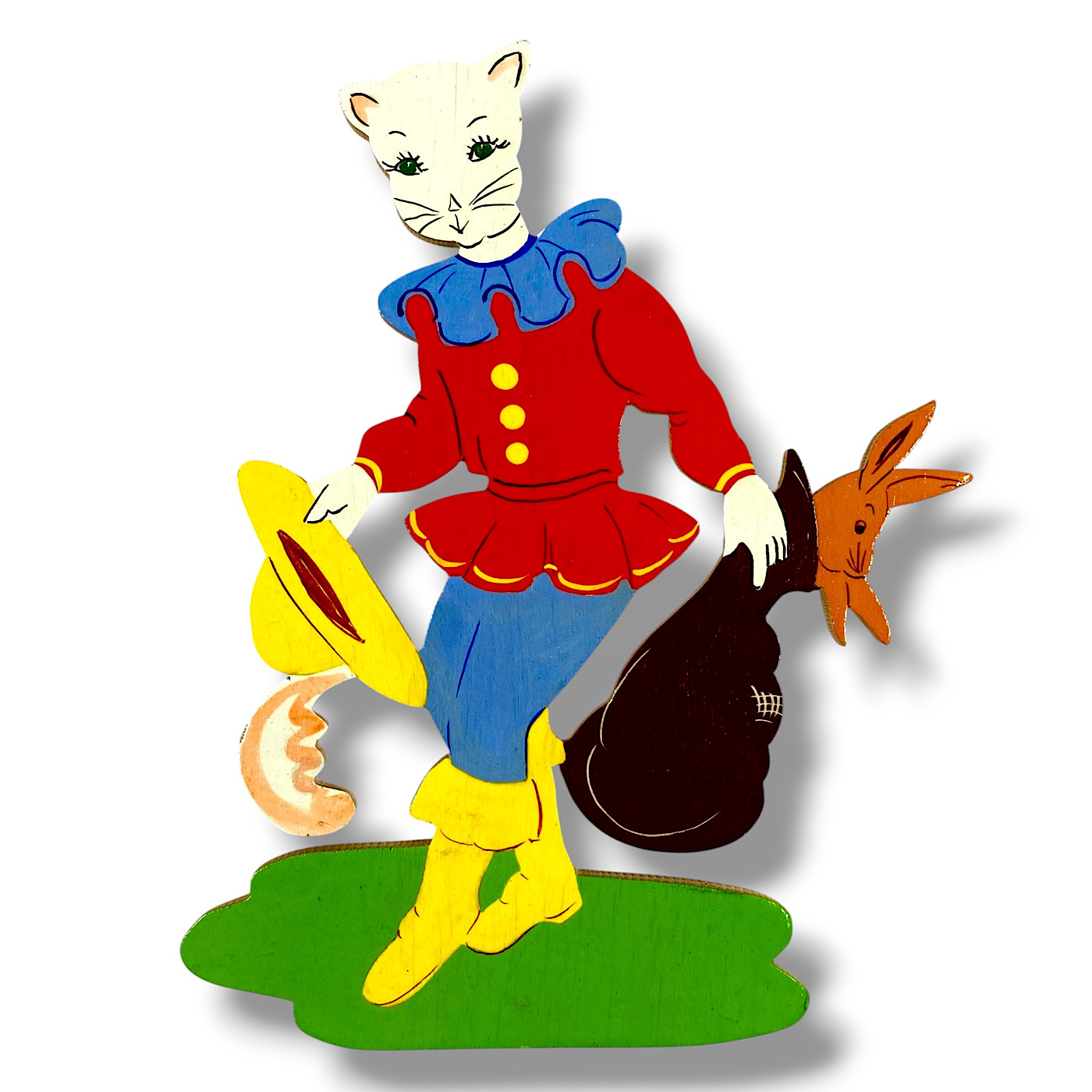1950er Holz-Wandfigur, Original Bergischer Engel, Märchen 15cm Gestiefelter Kater mit Hasensack, Handbemalt 🇬🇧 1950s Wooden Wall Figure, Original Bergischer Engel, Fairy Tale 15cm Puss in Boots with Hare Bag, Hand-painted
