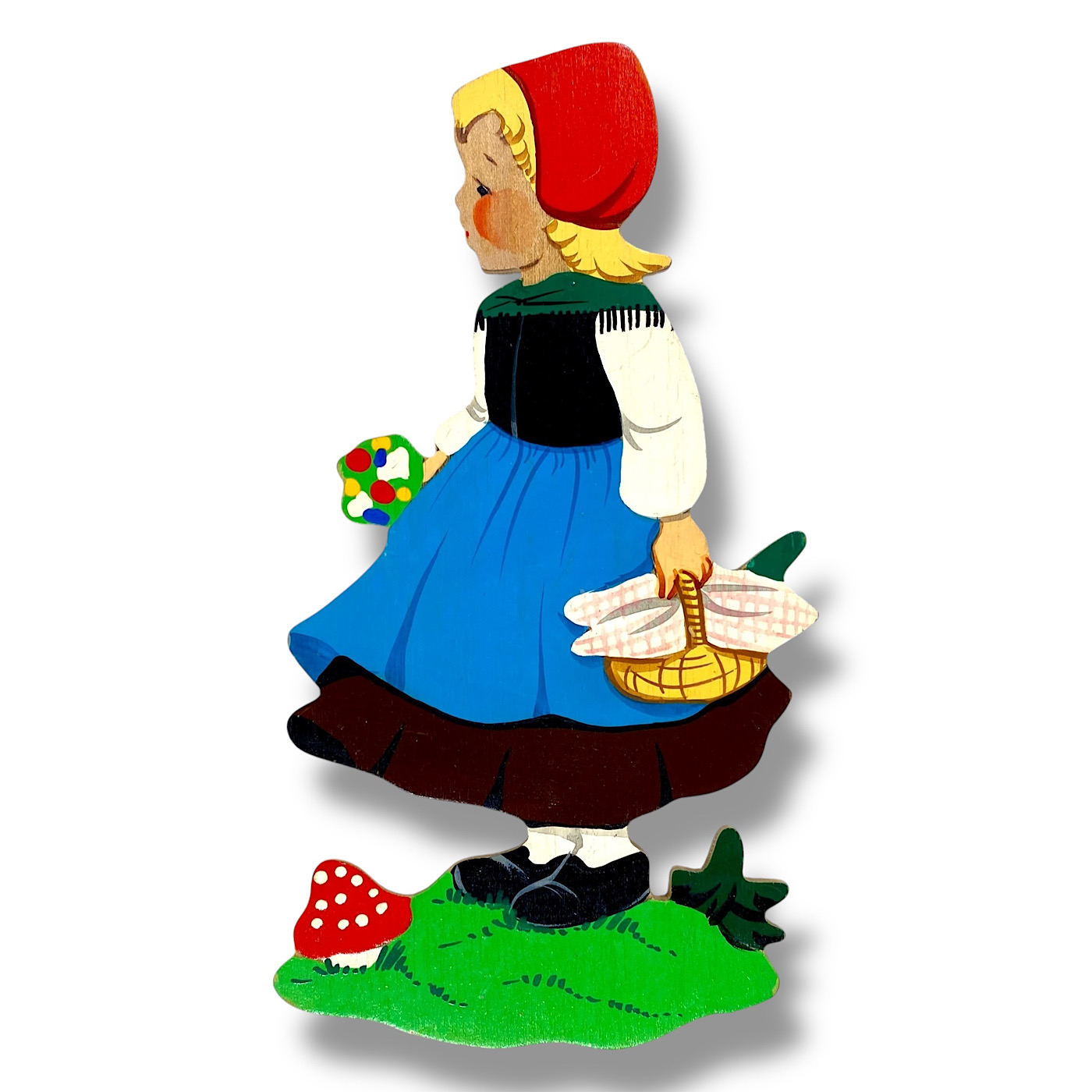 1950er Märchen-Holzbild von Grossmann Reit im Winkl: Hübsches kleines Rotkäppchen mit Fransentuch, Handbemalt, 16 cm 🇬🇧 1950s German Wall Figure by Grossmann Reit im Winkl: Small Little Red Riding Hood with Fringed Shawl, Hand-painted, 16 cm