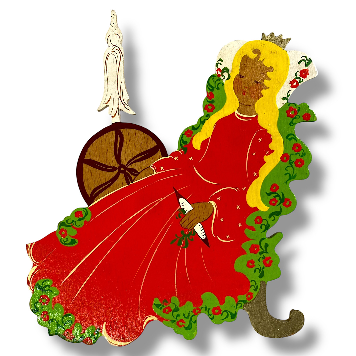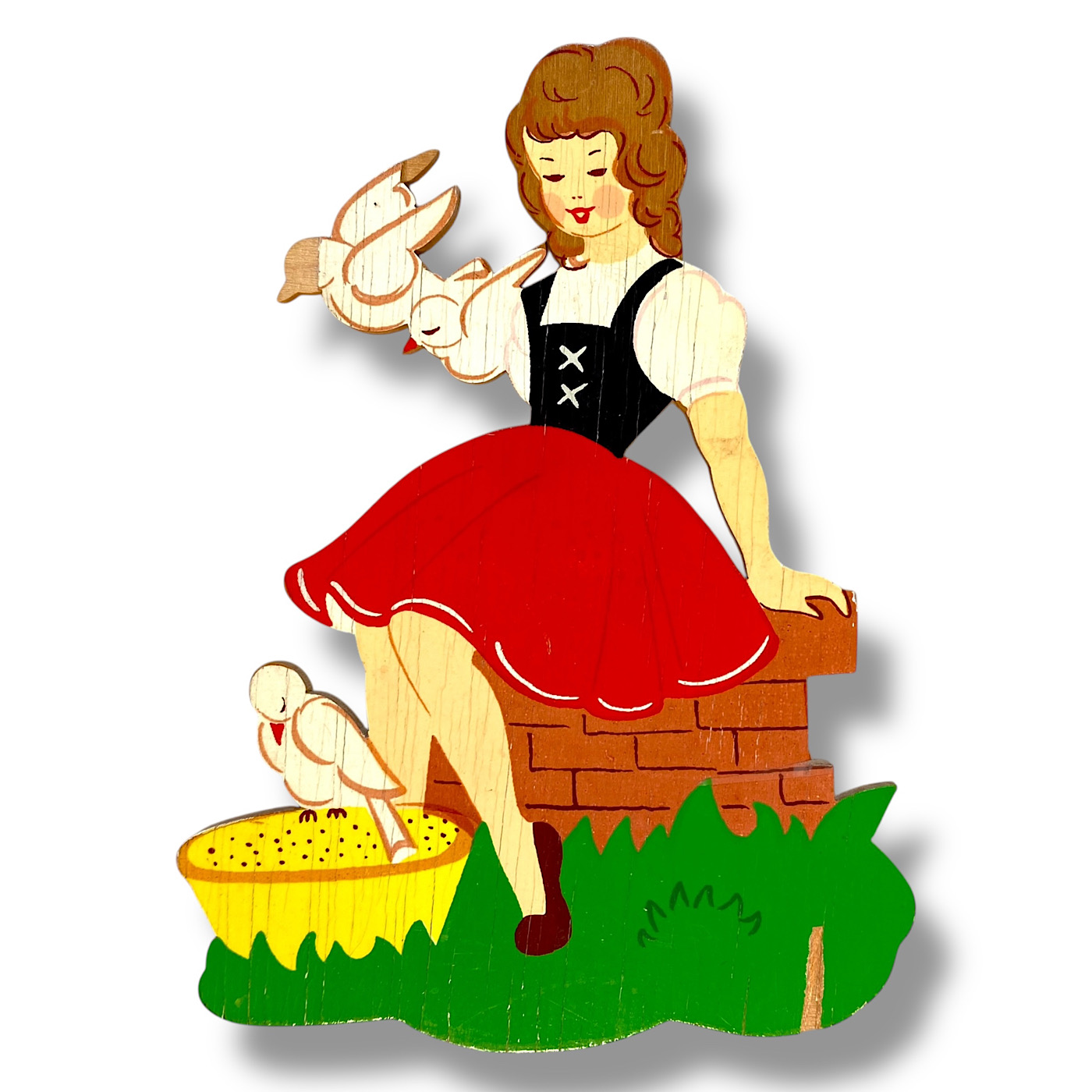 1950er Holz-Wandfigur Original Bergischer Engel Märchen 15cm Kleines rotes Mauer-Aschenputtel mit Schnürmieder 🇬🇧 Midcentury Wooden Wall Figure Original Bergischer Engel Fairy Tale 15cm Small Red Cinderella with Lace-Up Bodice