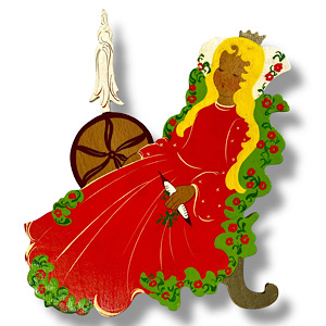 ORIGINAL BERGISCHER ENGEL, O-MÜNDER: Die frühen Holzbilder des Original Bergischer Engel aus den 1940er Jahren hatten oft einen erstaunten Ausdruck, weil der Mund ein längliches „O“ formte. Johanna Gruner-Witkop, die erste Besitzerin und Künstlerin des Original Bergischer Engel, hat mir im neuen Jahrtausend erzählt, dass sie zu Beginn ihres Betriebs in den Vierzigerjahren eine Freundin mit Design-Erfahrung hatte, die ihr sagte, dass gerade niedliche O-Münder und blonde Locken beliebt waren. Daher findet man häufig beides bei den frühen, noch ganz handbemalten Figuren des OBE: Die Froschkönig-Prinzessin mit dem blauen Sternenrock, die erste Version der Schornsteinfegerin (Hampelmann), das kleine blaue Aschenputtel und die Köchin mit der großen roten Schleife (Hampelmann). Die originelle Fischverkäuferin mit der kleinen Metallglocke in der Hand (Hampelmann) hatte zwar dunkle Locken, aber auch ihr Mund formte ein „O“, weil sie ihren Fisch anpries.
