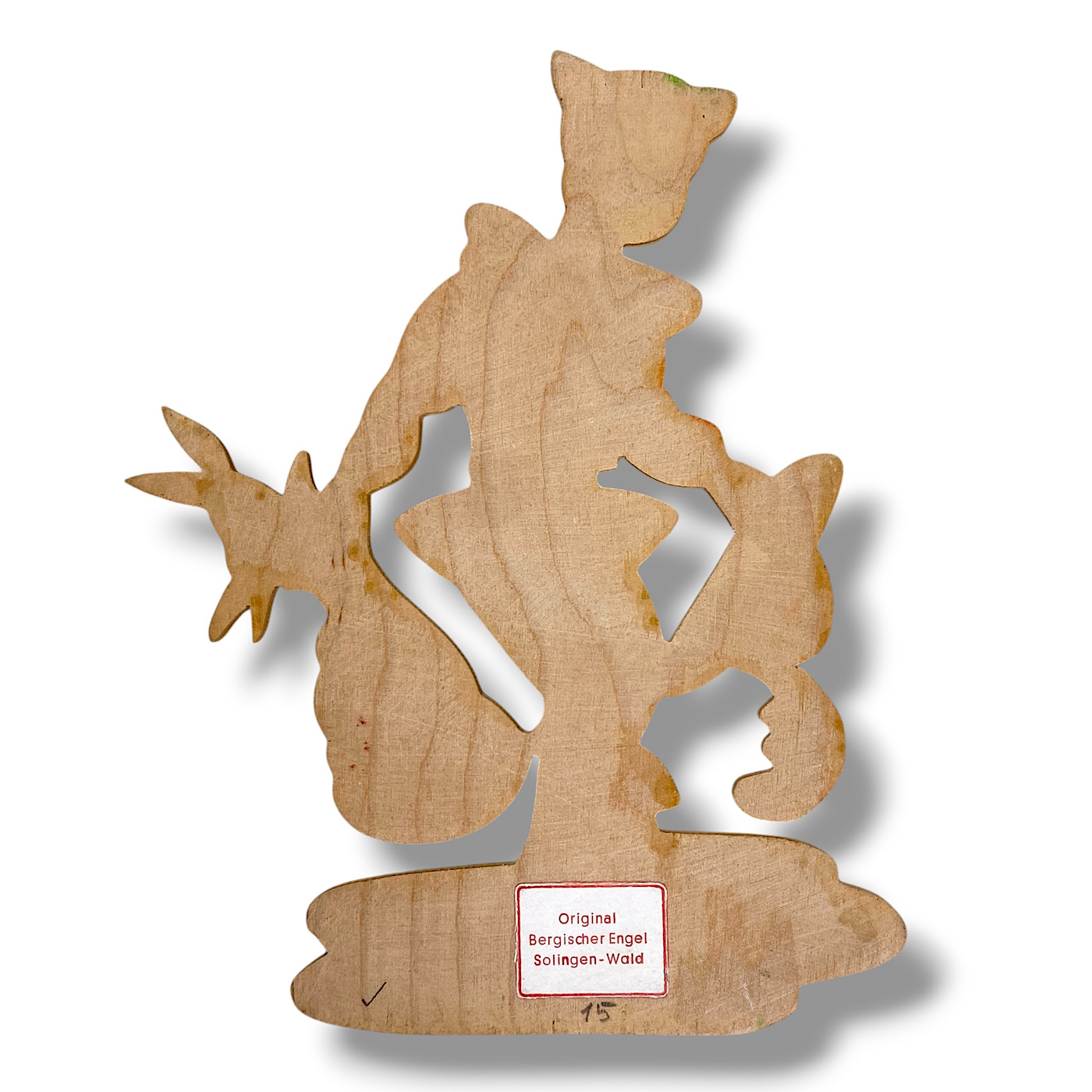 1960er Original Bergischer Engel: Kleiner Moritz mit Maikäfer-Baum, Siebdruck, 17 cm, Märchen-Holzbild 🇬🇧 1960s Original Bergischer Engel: Small Moritz with May Beetle Tree, Screen-printed, 17 cm, German Wall Figure