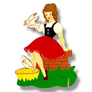 ORIGINAL BERGISCHER ENGEL, SCHNÜRMIEDER: Johanna Gruner-Witkop (1928-2023) hatte im letzten Jahrhundert alle frühen Entwürfe des „Original Bergischer Engel” gemacht. Zu ihren hübschesten Wandfiguren gehören die Märchen-Mädchen mit den Schürmiedern, zum Beispiel die beiden noch ganz handbemalten Froschkönig-Prinzessinnen mit ihren ausgestellten Röcken in Blau und Pink. Beide haben ein schwarzes Mieder mit jeweils drei x-Kreuzen untereinander, womit die Schnur angedeutete werden sollte. Es gab auch noch weitere Figuren des Original Bergischer Engel mit einer Art Schnürmieder, aber vor allem kamen sie in den ersten Jahrzehnten vor, also von den 1940er bis zu den 1950er Jahren.