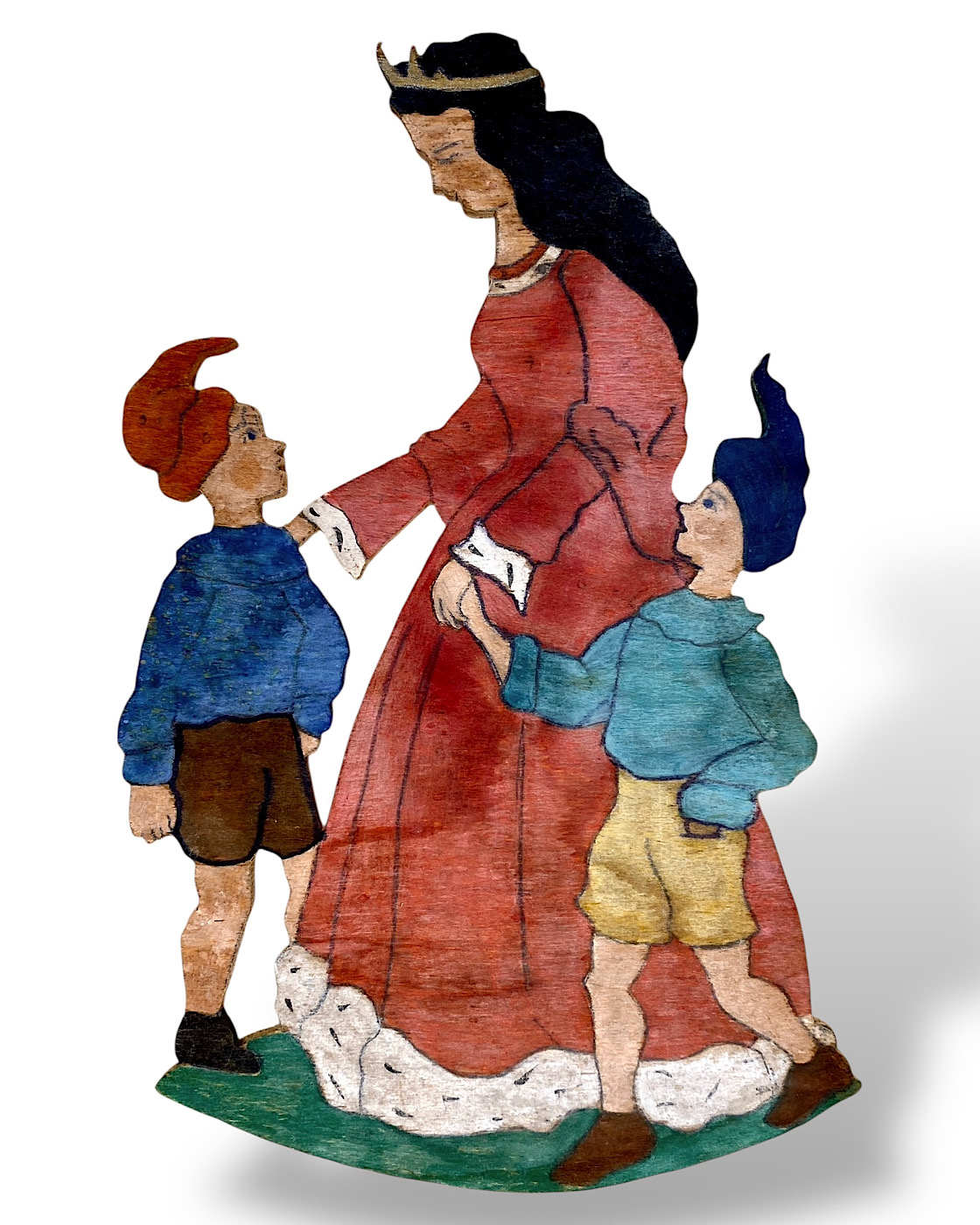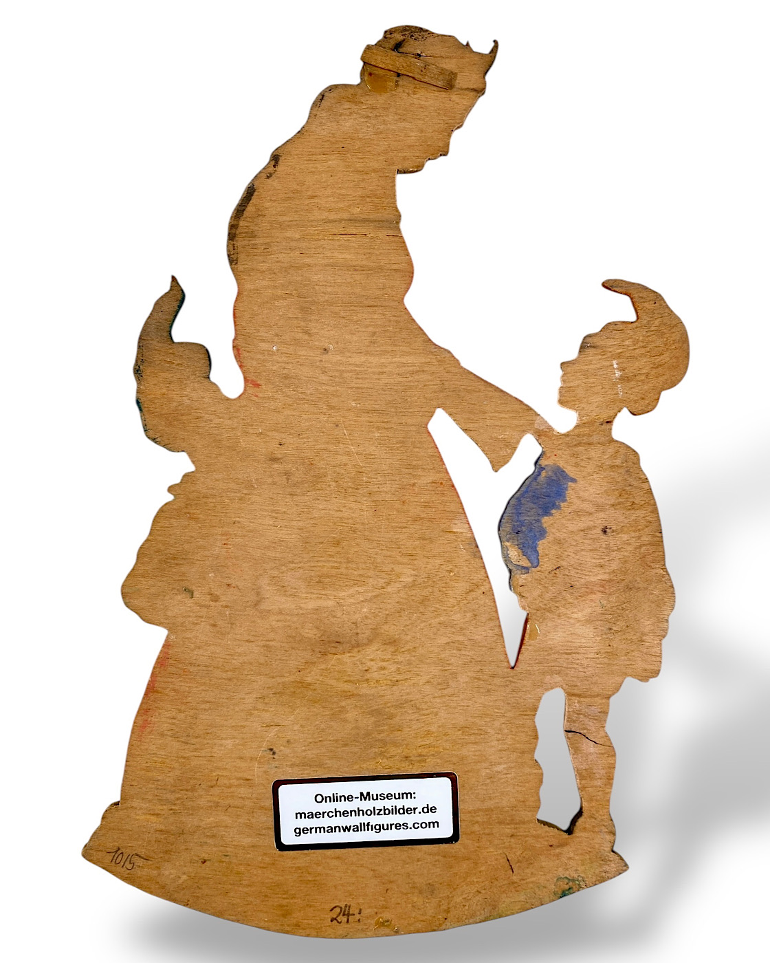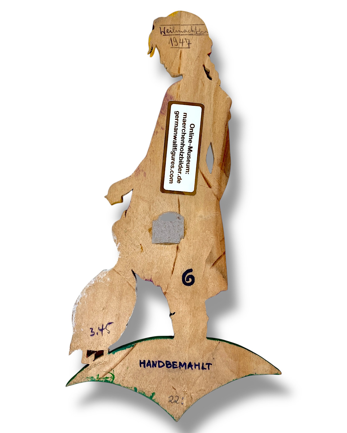 [EN] HOBBY CRAFTS, COPIES FROM MANUFACTURERS: The German Wall Figures of the large wood craft manufacturers of the last century were copied a lot. Most of the time you can tell right away that a fairy tale wood picture is a copy of a Mertens or Heller figure. But I’ve known a copy of the rare Hellerkunst Lantern Children that looks almost like the original. You have to look closely to tell the difference–it’s in the details, especially in the eyes. Sometimes I had first some across a copy of a rare Hellerkunst figure and only later found the original. I was always happy when my guess was right and the copy had indeed been modeled after an unknown original. That was for example the case with the very first Seven Ravens figure by Magda Heller. (From the Book: Vintage German Wall Figures, Die Ära der Märchen-Holzbilder, 2025, Christiane Dietz)