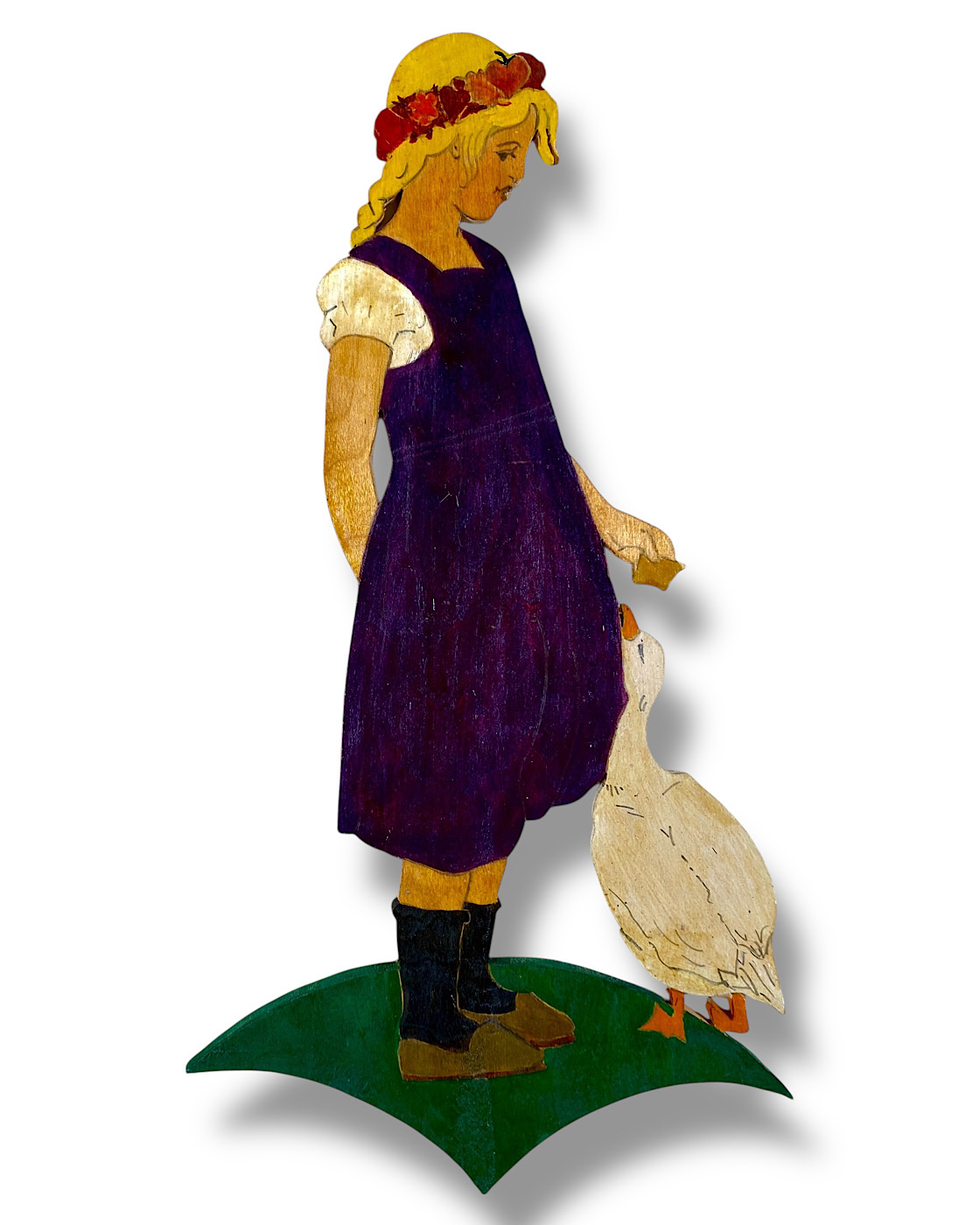 Laubsägearbeit Signiert „Weihnachten 1947“: Filigranes Blumenkranz-Mädchen, Gänsemagd 22cm [EN] Post-War Flower Crown Girl