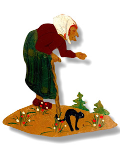 1930er Niedersachsen-Kunst: Gebeugte Hexe mit schwarzer Buckelkatze, Sperrholz, handbemalt 22cm [EN] Humpback Witch with Humpback Cat NIEDERSACHSEN-KUNST: Dieser Hersteller hat...