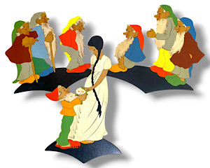 Mertens-Kunst © 1971: Tannen-Schneewittchen mit orangen sieben Zwergen in Rückansicht, ehemalige Garderobe, 0,9-cm-Sperrholz, Siebdruck, 27cm [EN] 1970s Alfred Mertens: Pinetree Snow...