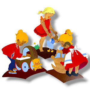 1950er Mertens-Kunst: Puppenmütter mit Puppenwagen, Wiege und beim Puppentanz, 20-21cm, Siebdruck, Märchenholzbilder [EN] 1950s German Wall Figures, doll mothers with...