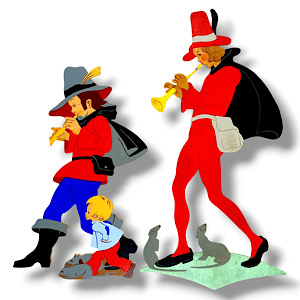 1940er (rechts) und 1970er (links) Mertens-Kunst: Früher und später Rattenfänger von Hameln, Sperrholz, 30cm/23cm [EN] 1940s (right) and 1970 (left)...