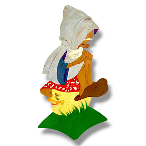 1960er Märchen-Holzbild, Unbekannter Hersteller: Große Strickliesel als Gänsemagd, aus der Praxis der Kinderärztin, Dr. Med. Marga Sauer, Fachärztin für Kinderkrankheiten,...