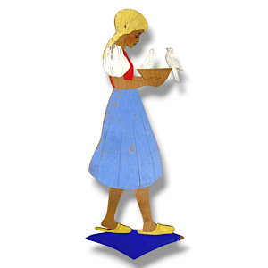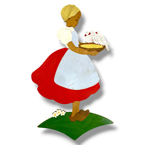 1960er Laubsägearbeit, Unbekannt: Mädchen mit Haube und Napfkuchen 13x18cm [EN] 1960s fretsaw craft, unknown : Girl with Bonnet and Bundt...