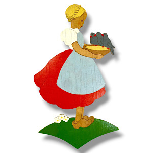 Eifelkunst mit Datum 1942: Sieben-Raben-Schwester mit rotem Schürzenkleid, Handbemalt 24cm [EN] Musing 7 Ravens Sister, WW2 * EIFELKUNST, STEMPEL: Ilse...
