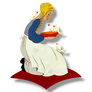 1950er Mertens-Kunst: Gänsemagd mit blondem Zopf rotem Kopftuch, Siebdruck 24cm [EN] Goose Girl with Blond Braid LANGHAAR-MÄDCHEN: Besonders in den...