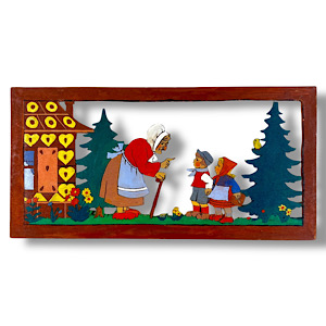 FRANKENWALDKUNST: Von dem historischen Hersteller „Frankenwaldkunst“ kenne ich bisher nur wenige Märchen-Holzbilder, aber sie sind sehr originell. Eines ist ein Bücherzwerg in einer Art Zipfelmützen-Kostüm; er hält nicht nur drei dicke Bücher in der Hand, sondern er steht auch auf einem großen Buch als Sockel. Die zweite Figur ist ein Seifenblasen-Mädchen, das unter einem Baum steht. Der Rückseiten-Stempel ist schön gestaltet – ein Oval mit einer großen Tanne darin und dem Wort „Frankenwaldkunst“ darum herum. Die Holzbilder stammen vermutlich aus den 1930er Jahren. Weiß jemand mehr über die schöne alte Frankenwaldkunst? Bitte schreiben Sie mir!