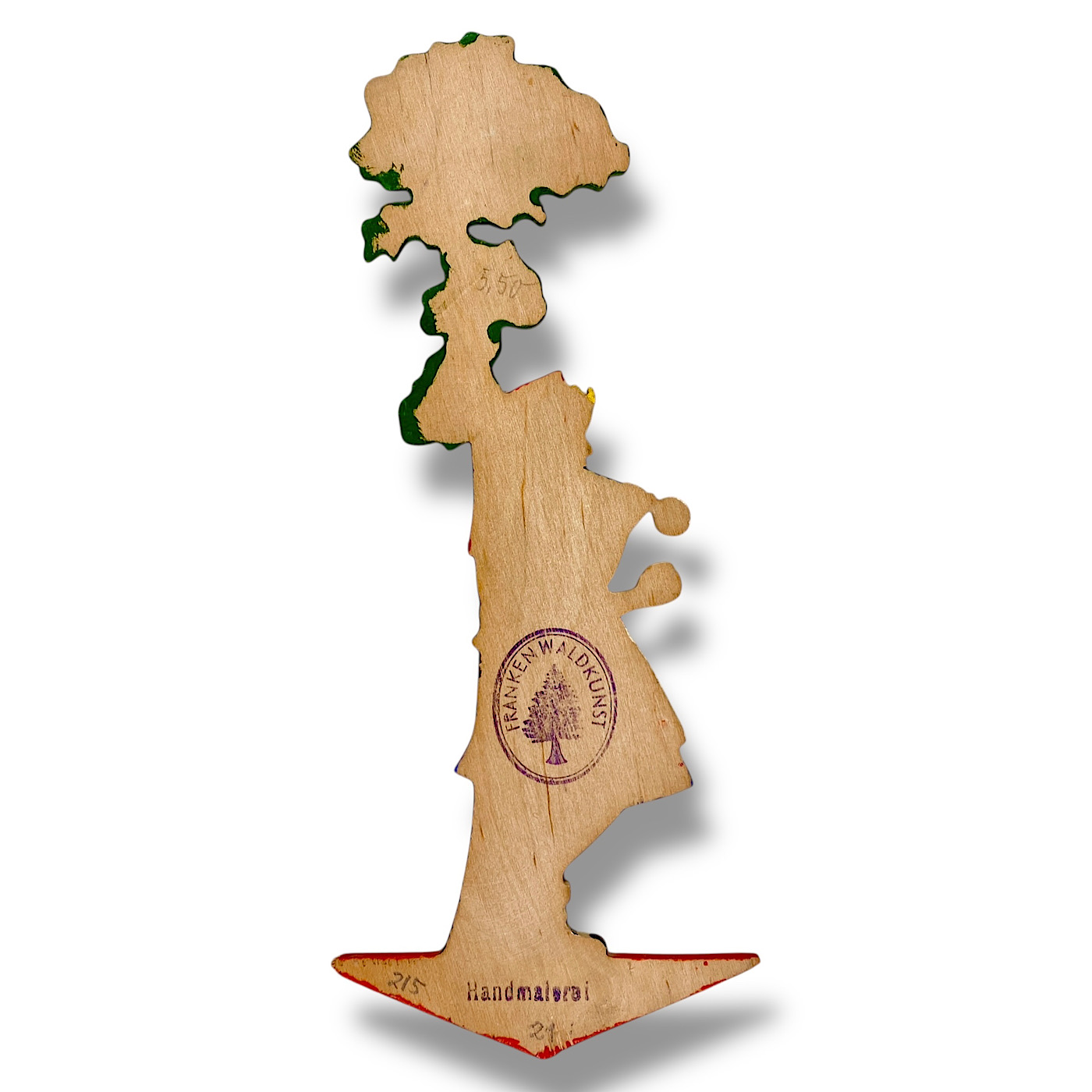 🇬🇧 FRANKENWALDKUNST: I only know a few German Wall Figures from the “Frankenwaldkunst” studio, but they are very original and beautifully crafted. “Frankenwaldkunst” translates to “Franconian Forest Art.” One wood picture by this producer is the book gnome in a kind of stocking-cap costume–Not only is he holding three thick books, he also stands on a large book used as the base. The second figure is a soap-bubble girl standing under a tree. The stamp on the back is beautifully designed: an oval with a large fir tree in the middle and the word “Frankenwaldkunst” around it. There is also a second stamp with the word “Handmalerei” (hand-painted). These wall figures probably date from the 1930s. Does anyone know more about the beautiful old Frankenwaldkunst? Please get in touch! (Buch/25)