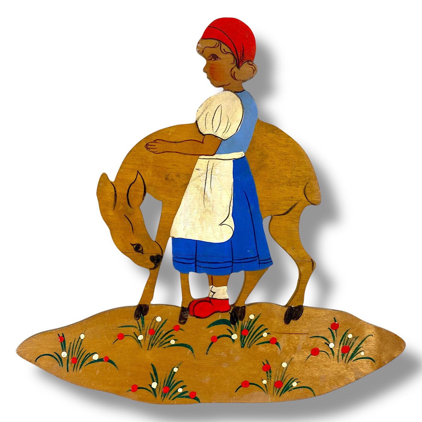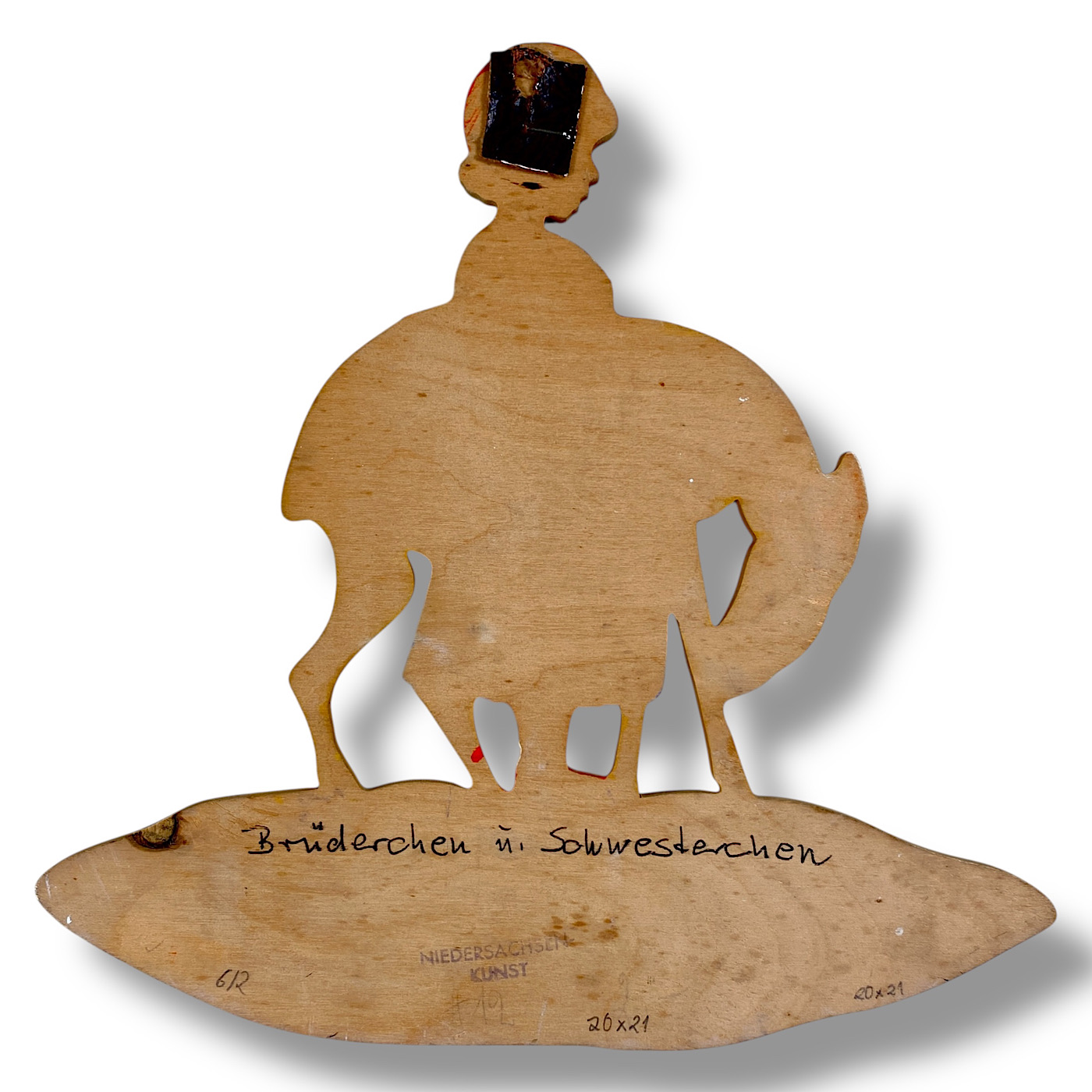 1930er Niedersachsen-Kunst: Brüderchen und Schwesterchen mit roter Kappe, handbemalt, 20x21cm, Märchen-Holzbild 🇬🇧 1930s Niedersachsen-Kunst: Little Brother and Little Sister with Red Cap, Hand-painted, 20x21cm, German Wall Figure