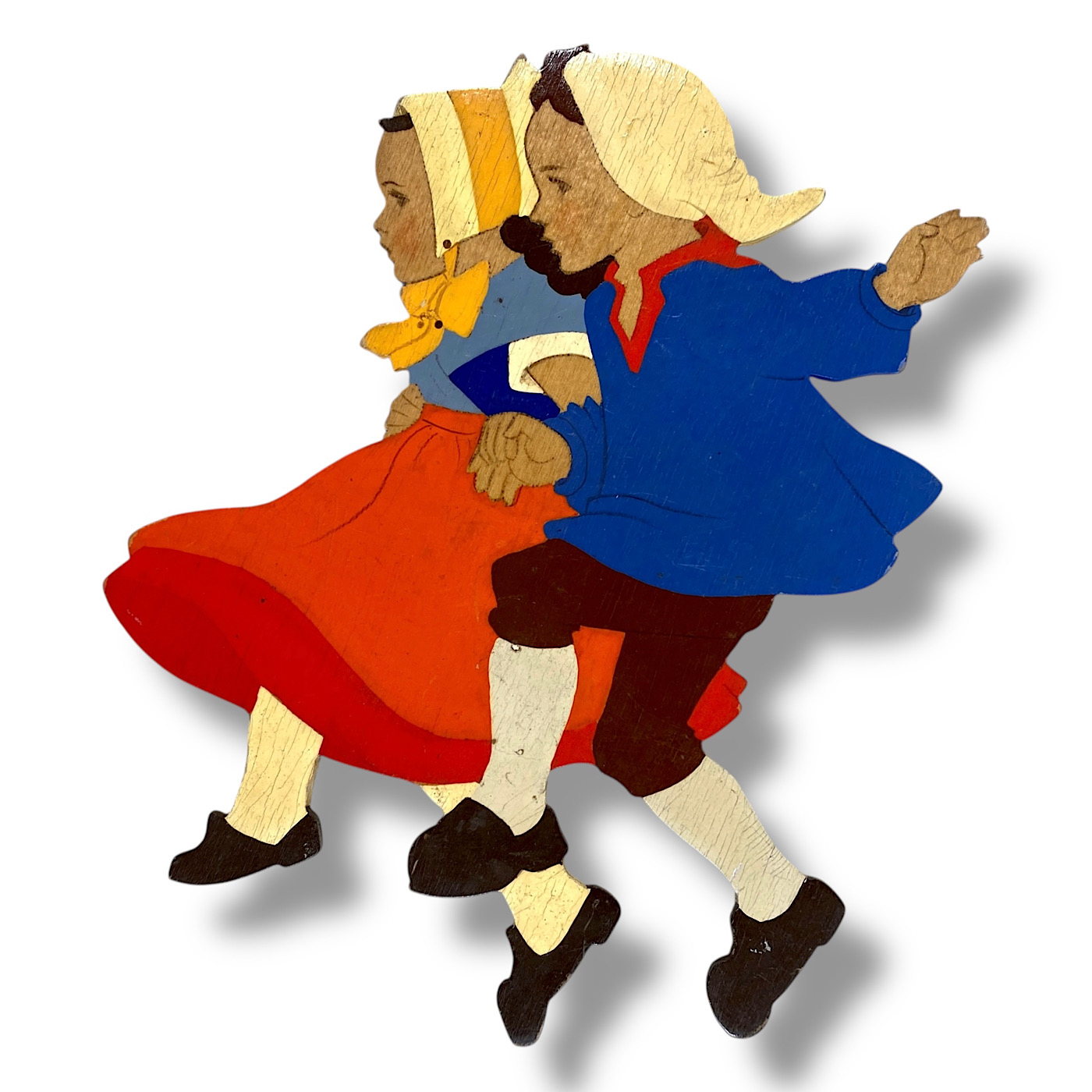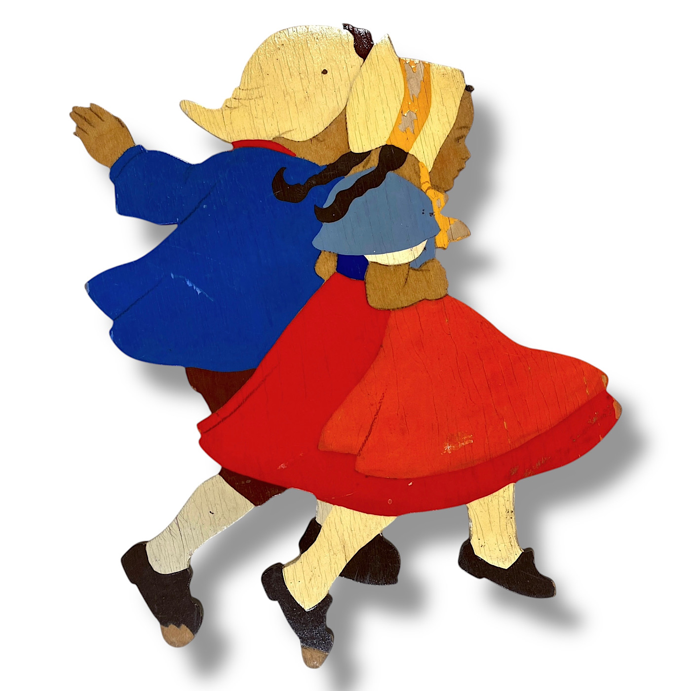 1940er Hellerkunst: Doppelseitig bemalte Rheinlandkinder 18x15cm Holz-Wandfigur 🇬🇧 Midcentury Rhineland Children, Painted Both Sides, German Wall Figure