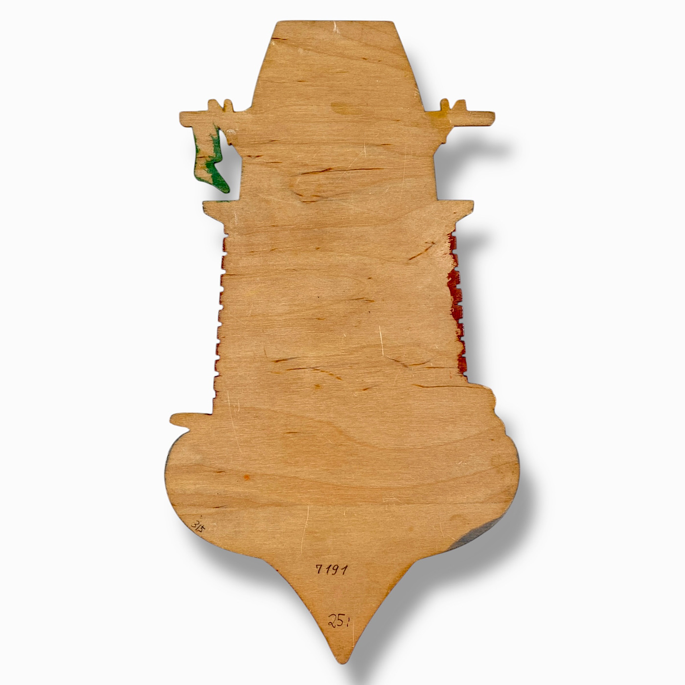 🇬🇧 HILLA: Among the most striking Hilla wall figures are the kissing teenagers standing on a large heart. Hilla probably produced them in southern Germany in the 1940s. There is a (most likely early) rectangular back stamp saying „Hilla, Kunstgewerbliche Handarbeit“ and a diamond-shaped one with „Hilla, Handwork, Made in Germany” (translated). Most Wall Figures by Hilla are smaller and thicker than what was common at the time, with rich colors and a thick layer of varnish. The motifs are consistently unmistakable Hilla designs, such as the lace-underwear Little Red Riding Hood with protruding braids, the little Bavarian boys in lederhosen, and a children’s ring-around dance of apron girls whose smiles show every single white tooth—also typical of Hilla. The beer mug man and the lamppost lover bear rhymes written in Sütterlin: „If you suffer heartache and grief, take the lamppost to your heart (translated).” Does anyone know more about Hilla? Please get in touch! (Buch/25)