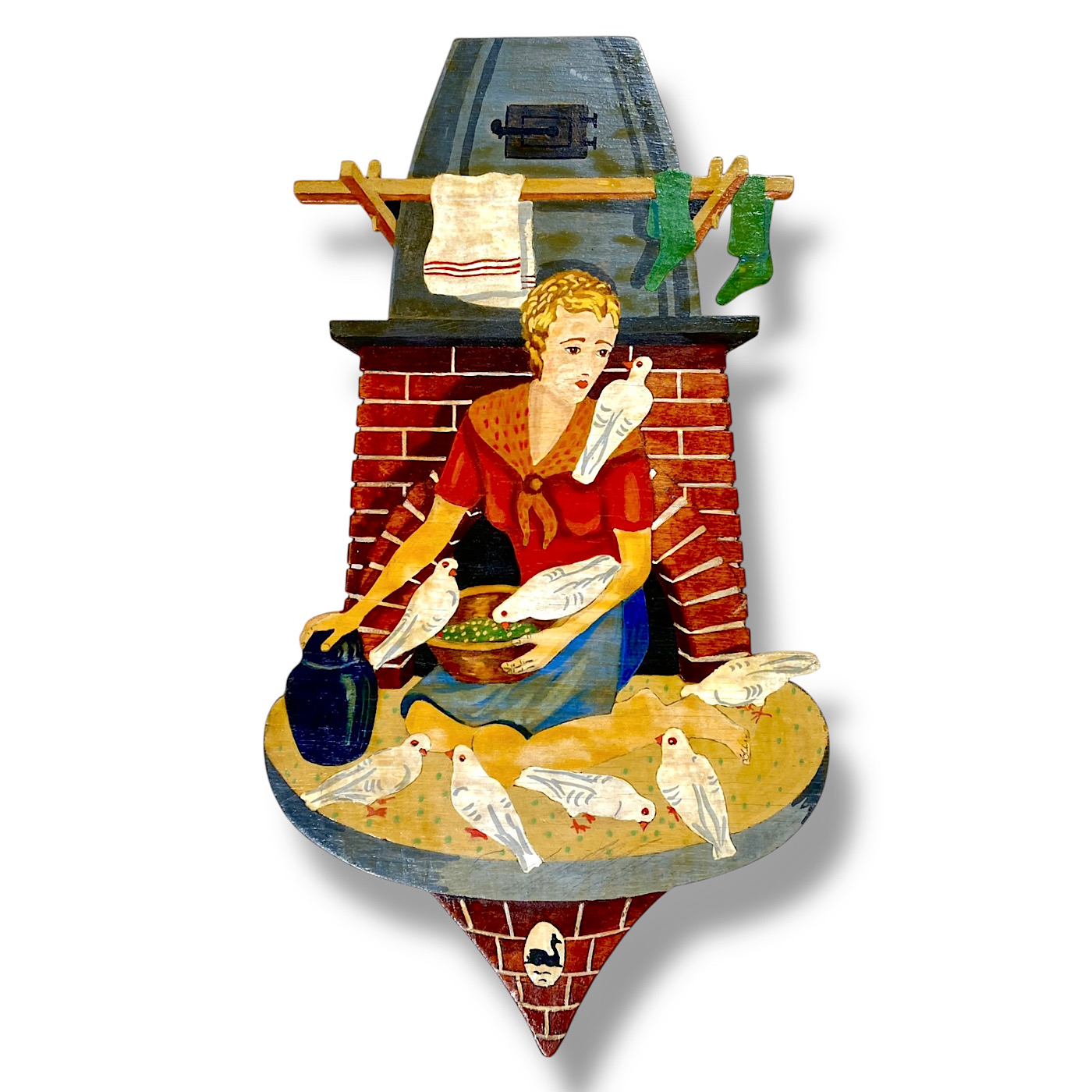 1940er Hilla: Aschenputtel mit Sockenkamin 24 cm 🇬🇧 Midcentury Cinderella with Fireplace Stockings (Märchen-Holzbild, German Wall Figure)