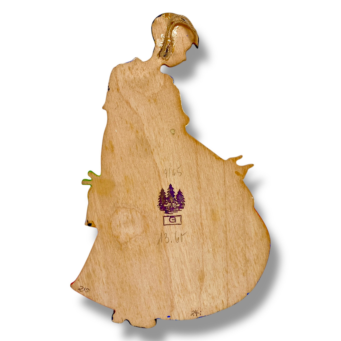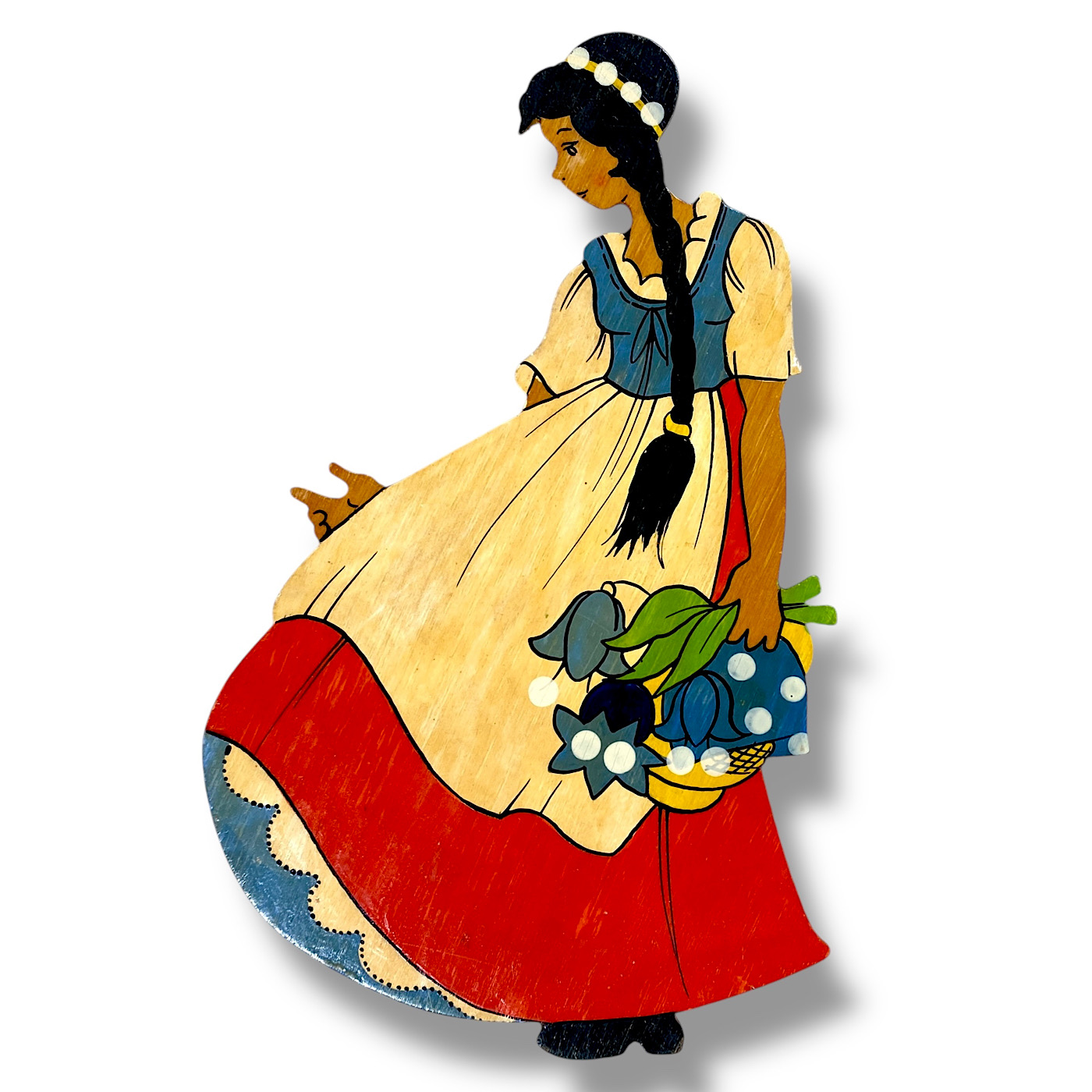 1960er Eva Günther: Schneewittchen mit schwarzem Zopf 24cm 🇬🇧 Midcentury Snow White with Black Braid (Märchen-Holzbild, German Wall Figure)