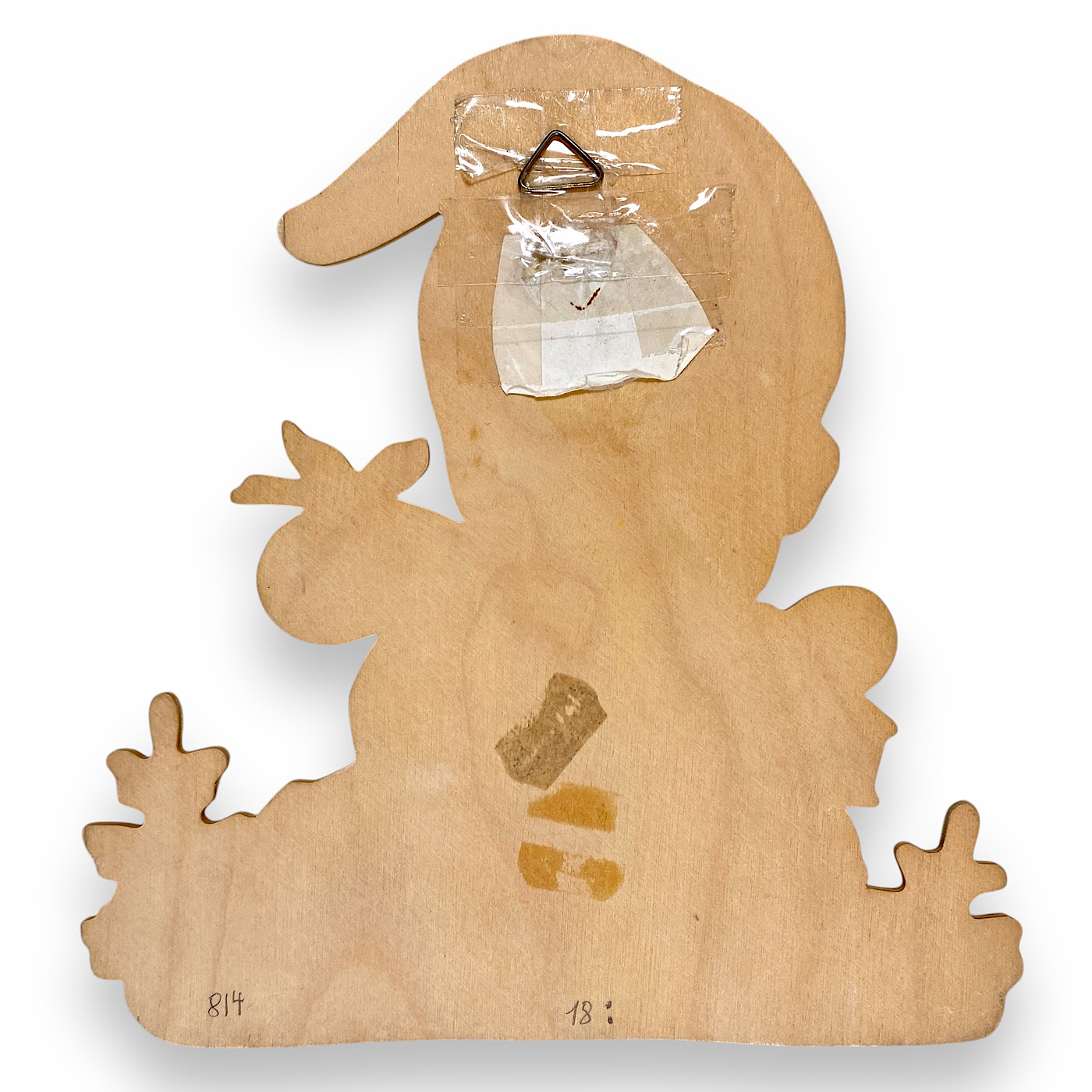 🇬🇧 GROSSMANN, DWARFS: Cute gnomes were practically the specialty of Grossmann Reit im Winkl in Upper Bavaria. The Grossmann dwarf plaques developed over nearly half a century. In the 1940s and 1950s the figures were still entirely hand-painted, later screen-printed. The faces of the dwarfs changed over time as well: Their heads became larger and (even) cuter, in line with the so-called “baby schema,” which was also true of most other German Wall Figure manufacturers of the time. Particularly charming examples include: the shoemaker dwarf with his workshop, the night watch dwarf with a long cape, and the cheerful dwarf with a piggyback child. (Buch/25)
