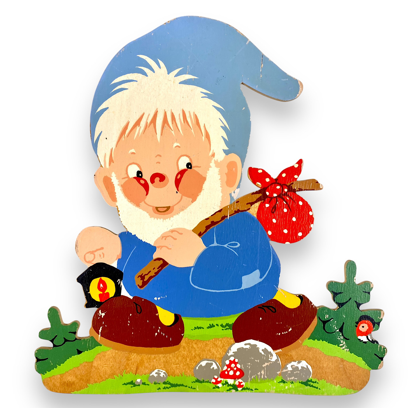 1970er Grossmann Reit im Winkl: Blauer Zwerg als Wanderer mit rotem Beutel, Siebdruck, 18 cm, Märchen-Holzbild 🇬🇧 1970s Grossmann Reit im Winkl: Blue Dwarf as Traveler with Red Pouch, Screen-printed, 18 cm, German Wall Figure