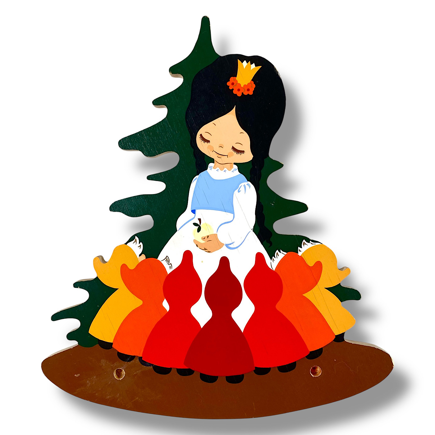Mertens-Kunst © 1971: Tannen-Schneewittchen mit orangen sieben Zwergen in Rückansicht, ehemalige Garderobe, 0,9-cm-Sperrholz, Siebdruck, 27cm [EN] 1970s Alfred Mertens: Pinetree Snow White with orange seven dwarfs in back view, former coat rack, 0,9 cm plywood, screen-printed, 27cm
