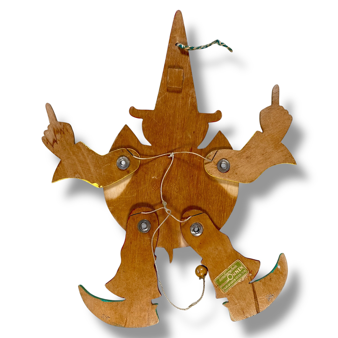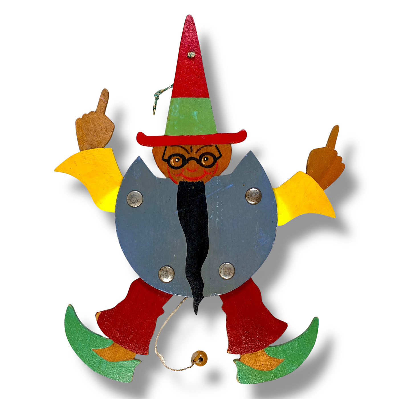1950er Hellerkunst: Seltener Zauberer mit spitzem Hut, Handbemalt, Hampelmann, 26cm 🇬🇧 1950s Hellerkunst: Midcentury Wizard with Pointed Hat, Hand-painted, Jumping Jack, 26cm
